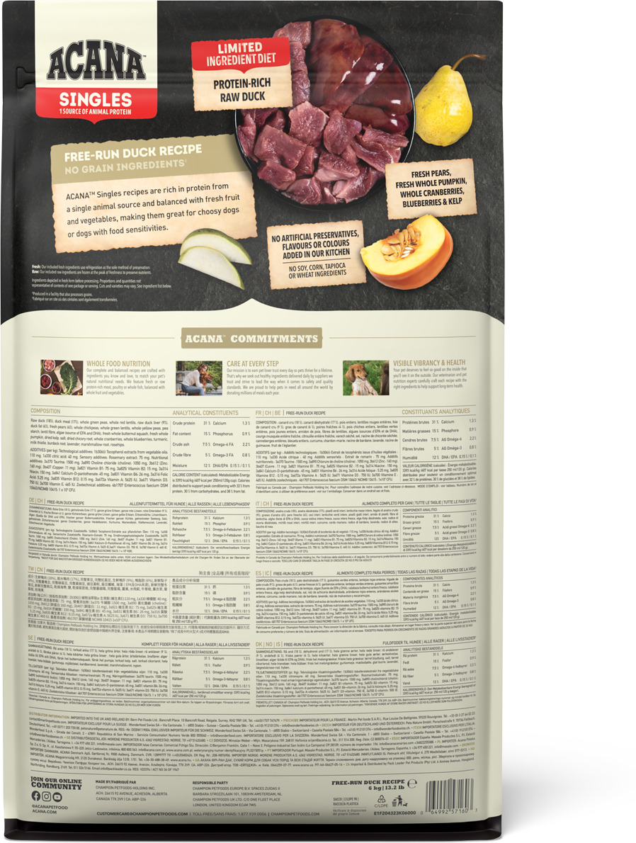 Az Acana Free-Run Duck 50%-ban szabadon tartott kacsák húsából készül. A könnyen emészthető, ízletes kacsahús a kizárólagos állati fehérjeforrás ebben a szuperprémium kutyatápban, ezért allergiagyanú esetén is tökéletes választás, például egy eliminációs-provokációs diétához. A víziszárnyasokat szabadon tenyésztik Kanada Ontario tartományának mezőgazdasággal foglalkozó részén. Az alapanyagok emberi fogyasztásra alkalmasak, és naponta frissen érkeznek.