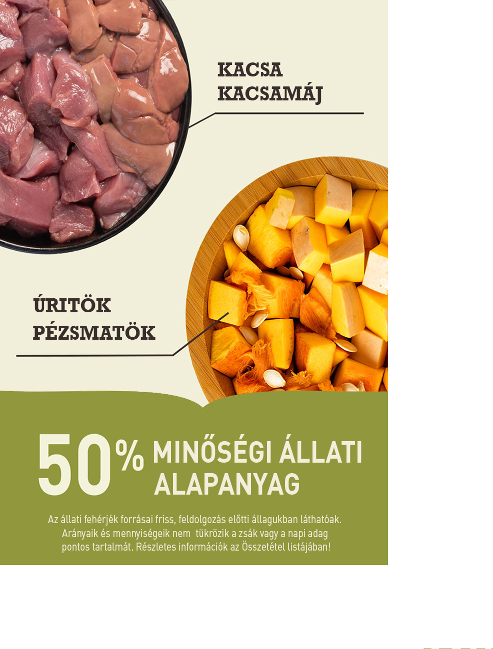 A felhasznált kacsahús 50%-a nyers, a másik fele szárított. A felhasznált állati alapanyagok emberi fogyasztásra alkalmasak.