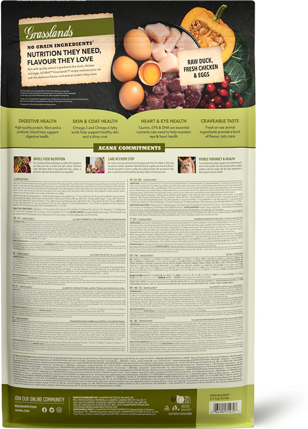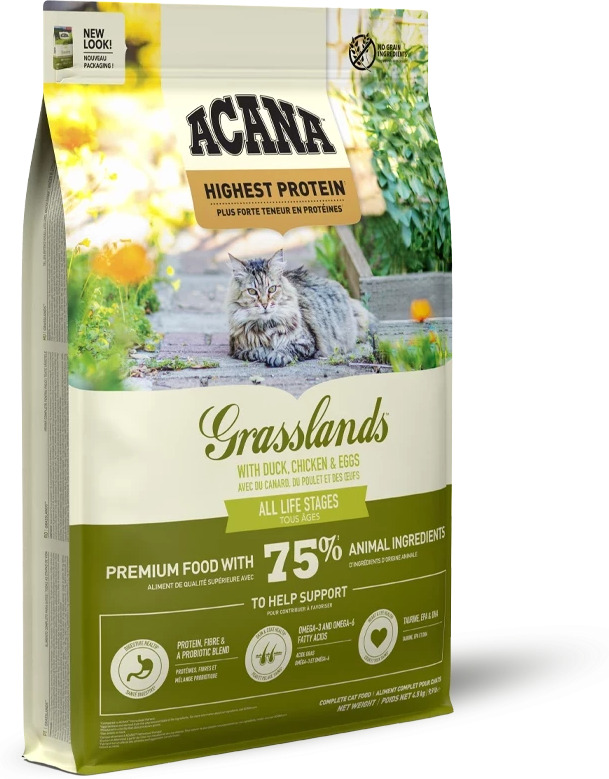 A páratlan természeti adottságokat jól tükrözi a gabonamentes Acana Grasslands Cat & Kitten termék; a négy különféle fehérjeforrás (75%) biztosítja az állat összes aminosav-szükségletét a megfelelő mennyiségben és arányban.