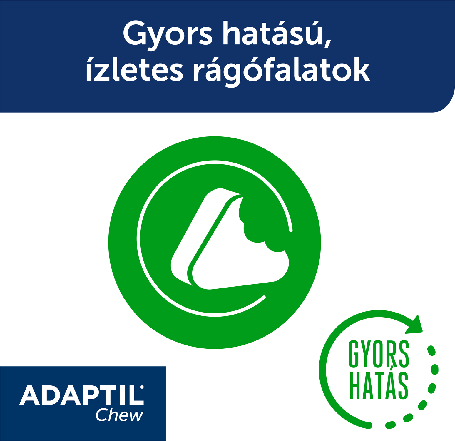 Az Adaptil Chew gyors hatású: a rágófalatot körülbelül harminc perccel a várható stresszes esemény előtt ajánlott adni. Puha állagának köszönhetően könnyen felezhető, és kifejezetten kutyák számára fejlesztették ki, így a legtöbb kutya szívesen fogyasztja.