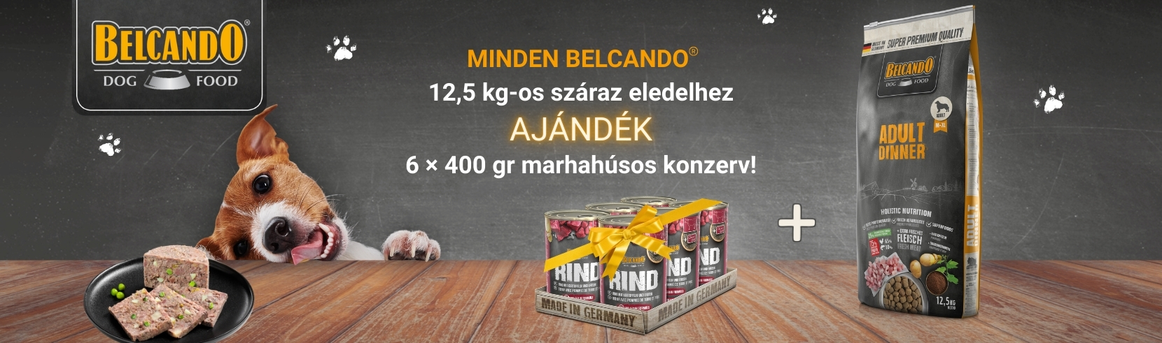 Most minden standard 12.5 kg-os Belcando táp mellé ajándék 6 x 400 g-os Belcando marhahúsos konzervet adunk ajándékba.