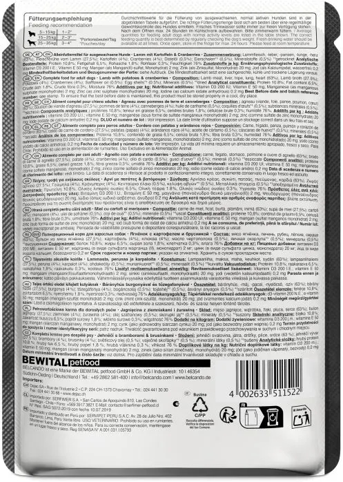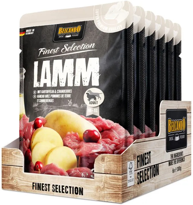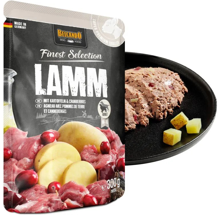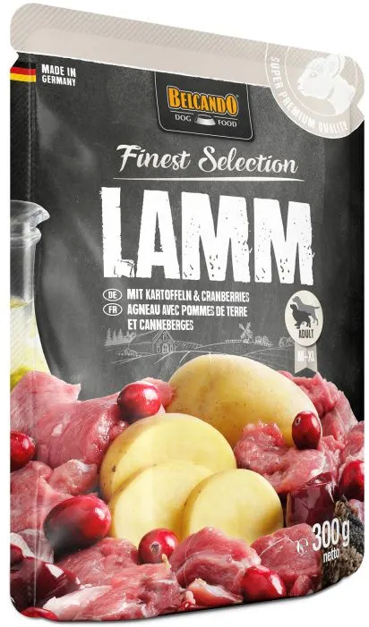 Belcando bárányhús burgonyával és tőzegáfonyával 125 és 300 gr-os kutyaeledel. Kiváló receptúrák egy etetési méretben csomagolva. Szaftos, finom hozzávalókkal ízesített, kíméletesen főzött hús, tasakba kiporciózva. A hidegen sajtolt bogáncsolaj létfontosságú telítetlen zsírsavakat ad hozzá. A Belcando Finest Selection rendkívüli ízletességének és hasznosíthatóságának köszönhetően kiváló az érzékeny és válogatós kutyáknak.