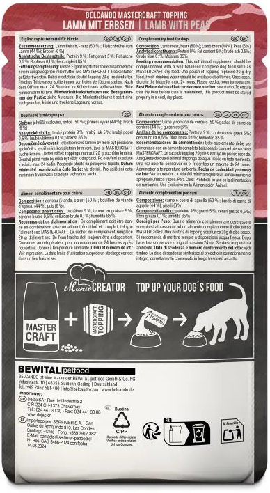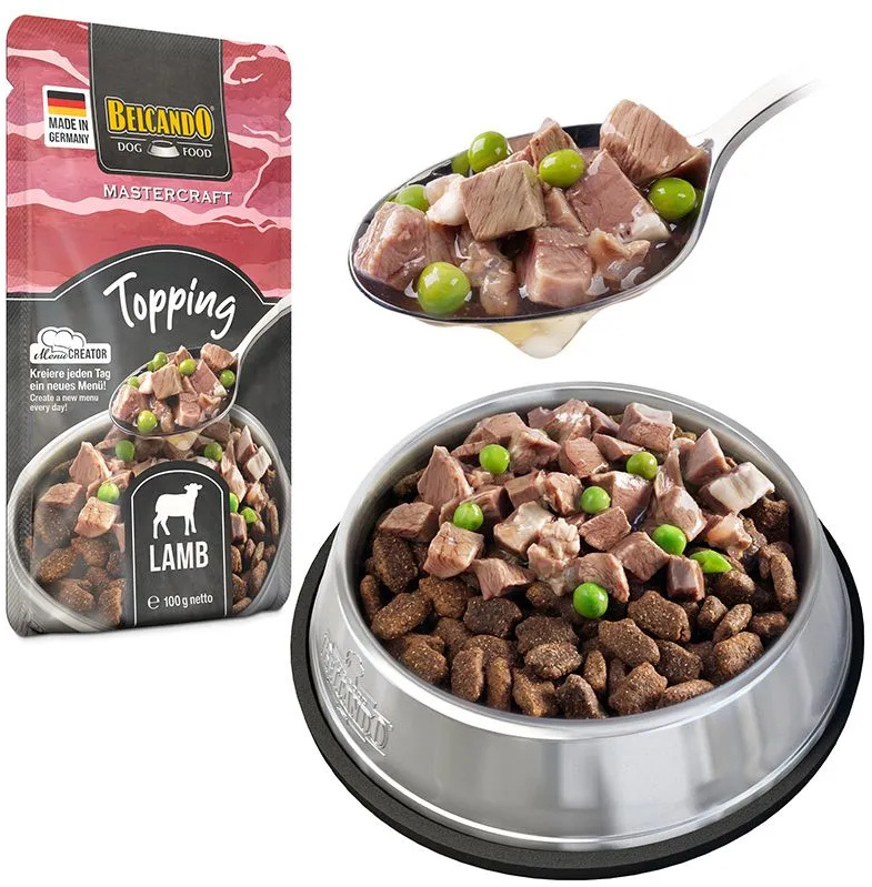 A Belcando Mastercraft Topping Lamb egy friss bárányhúsból és borsóból készült szuperprémium feltét, amellyel megkoronázhatjuk négylábú ínyencünk szárazeledelét, még ízletesebbé téve azt. A kutya különlegesen jól hasznosítja a húst, melyben számos aminosavon túl vitaminokat és nyomelemeket tartalmaz. Feldolgozása során igyekeznek minnél frissebben és kíméletesebben feldolgozni az alapanyagokat, így kevesebb a tápanyag veszteség, valamint nincs hozzáadott húsliszt. Magas hústartalom (80%) mellett további holisztikus hozzávalók találhatóak meg a receptben. Gabona és burgonya helyett amarantot, borstót, lóbabot és csicseriborsó található a feltétben melyekben az értékes fehérjék mellett rostok és nyomelemek is megtalálhatóak.