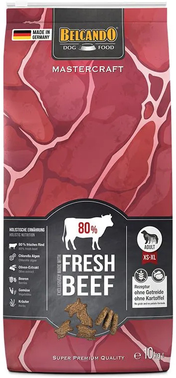 Belcando Mastercraft Fresh Beef összetétel: friss marhahús (80 %); amaránt (5,5 %); borsódara; bab liszt (Vicia faba); csicseriborsó, szárított; szárított sörélesztő (1 %, ß-glukán és mannán-oligoszaharid forrás); tengeri zooplankton, darált, őrölt (világítórák, 0,8 %); szárított szentjánoskenyér-hüvely; almatörköly, szárított; dikalcium-foszfát; azték zsályamag (0,4 %); zöldség, szárított (összesen: 0,3 %; sárgarépa, paszternák, cékla, póréhagyma); mésztartalmú tengeri alga (0,3 %, Lithothamnium calcareum); hidrolizált baromfimáj; szárított alga (0,2 %, zöld alga); nátrium-klorid; tőzegáfonya (0,06 %); erdei gyümölcsök, szárított (összesen: 0,06 %; berkenye, csipkebogyó, fekete áfonya, fekete bodza, ribizli); szárított gyógynövények (összesen: 0,06 %; csalánlevél, tárnicsgyökér, ezerjófű, kamilla, ánizs, kömény, fagyöngy, cickafark, szederlevél); kálium-klorid; moháve jukka; oliva-kivonat (0,003 %, európai olajfa)
