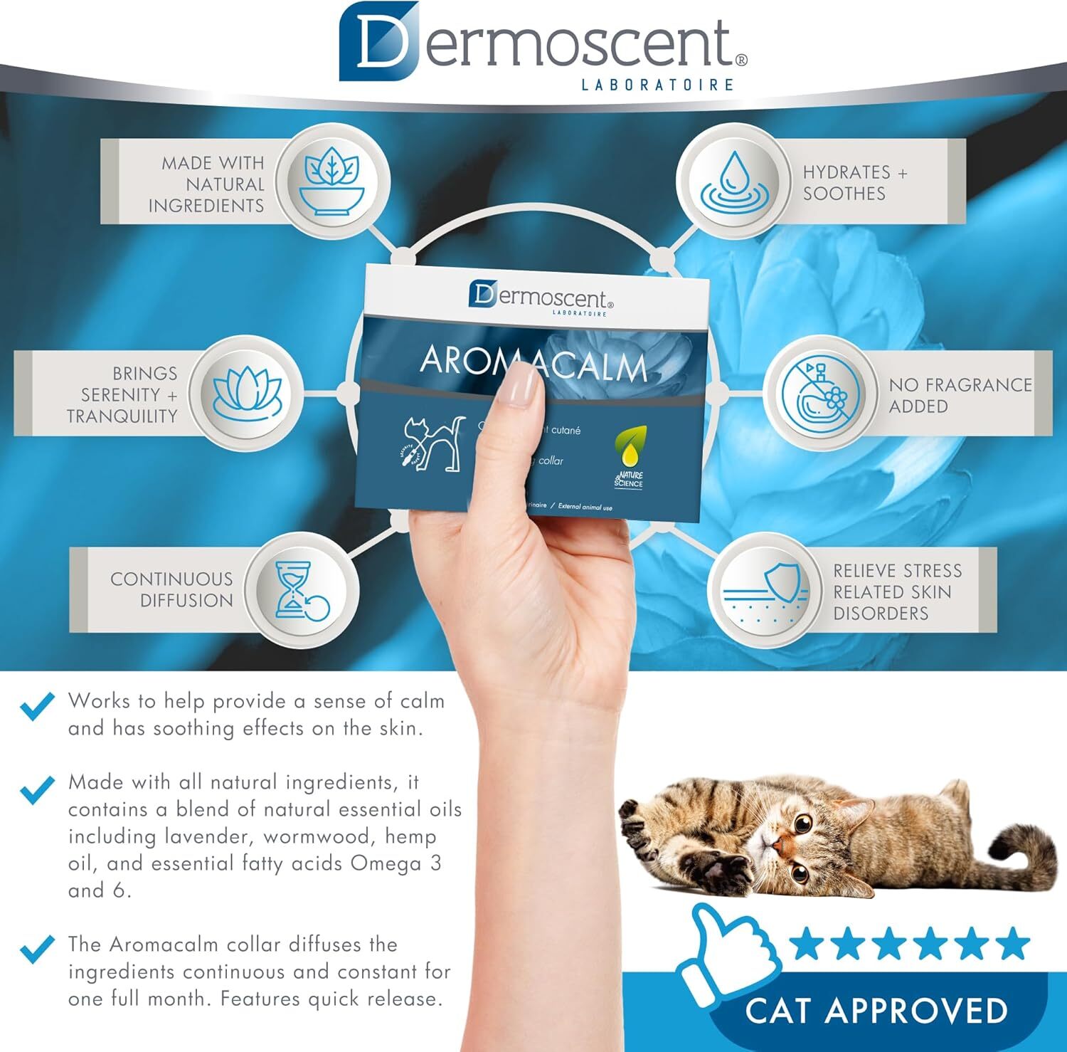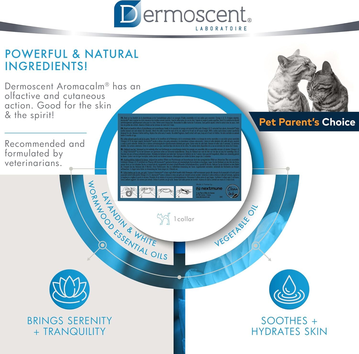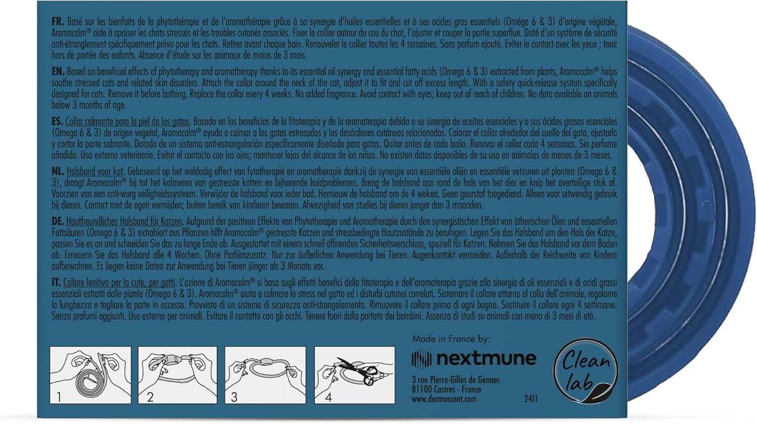 A Dermoscent Aromacalm nyakörv természetes aromaterápiás megoldás macskáknak, amely segít a stressz oldásában, miközben nyugtatja és hidratálja a bőrt. Ideális költözés, állatorvosi vizit, tűzijáték idején, de számos egyéb stresszt okozó körülmény enyhítésére is alkalmas.