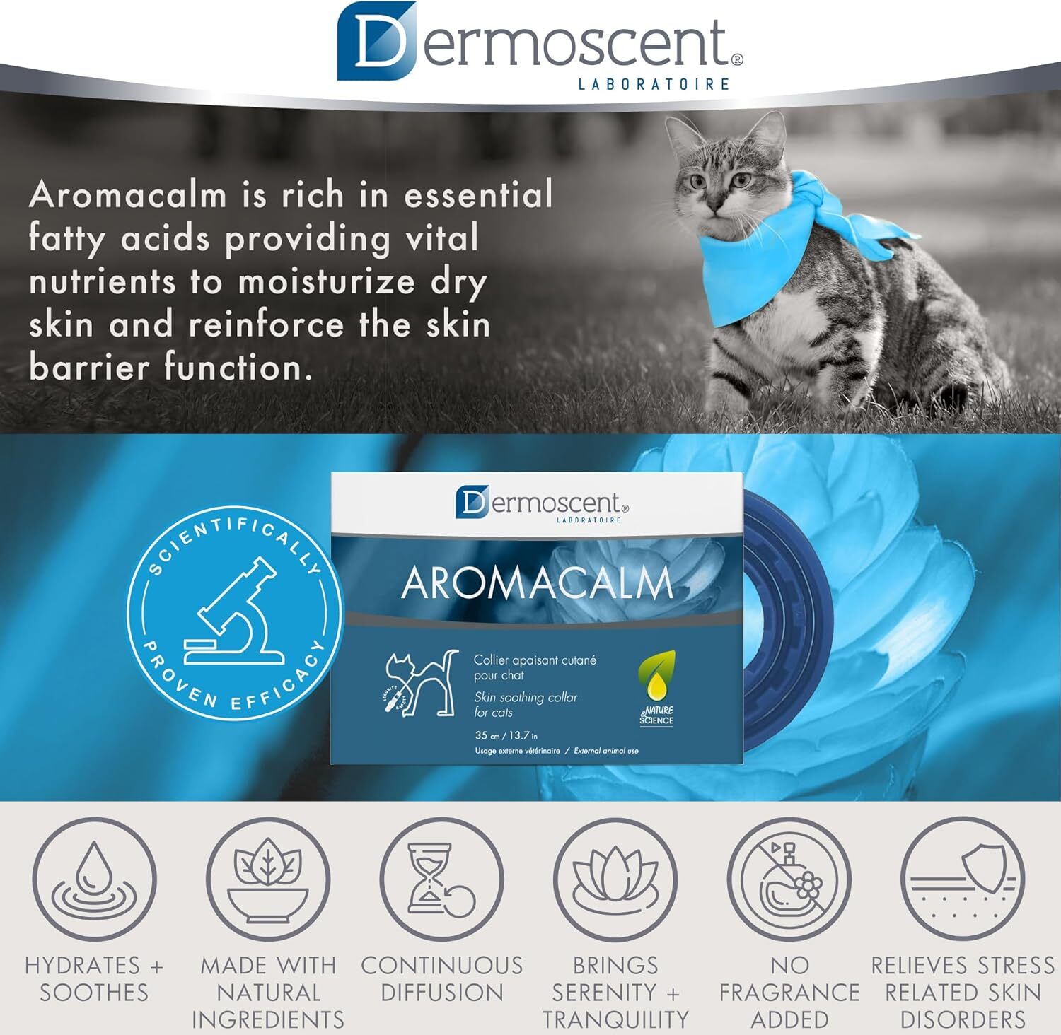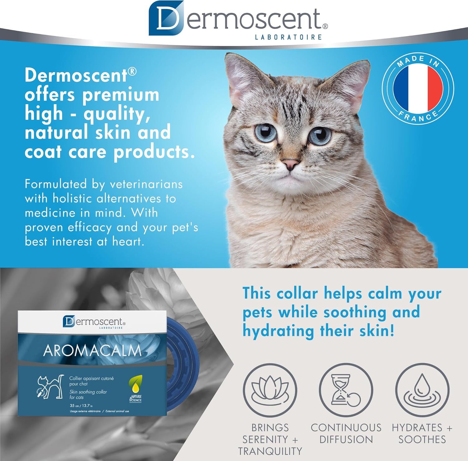A Dermoscent Aromacalm nyakörv kifejezetten stresszre hajlamos macskáknak készült, hogy elősegítse a nyugalmat, csökkentse a feszültséget és támogassa a bőr egészségét. A készítmény összetétele növényi hatóanyagokra és aromaterápiás illóolajokra épül, így kettős hatást fejt ki: megnyugtatja az állatot, miközben ápolja és hidratálja a bőrt.