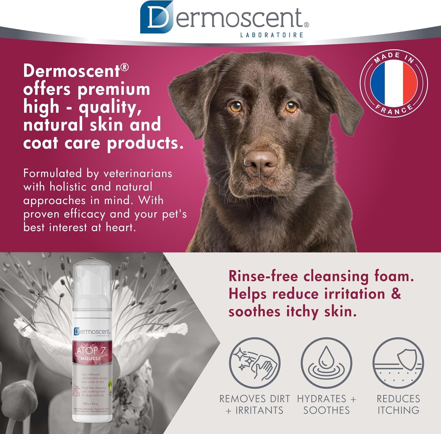 A Dermoscent ATOP 7 Mousse a természetes, vízmentes bőrápolás ideális megoldása – tisztít, nyugtat, hidratál és támogatja a bőr egészségét.