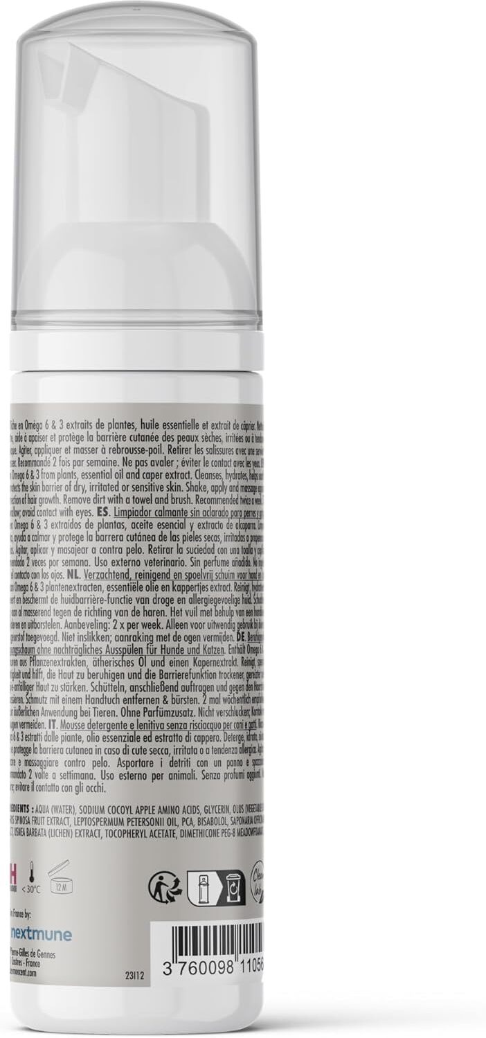 A Dermoscent ATOP 7 Mousse egy praktikus, természetes összetevőkből készült, szappanmentes hab az érzékeny, száraz vagy allergiára hajlamos bőr kíméletes tisztítására és megnyugtatására. Pumpás adagolóval ellátott flakonban kapható, aeroszolmentes formulája kíméletesen távolítja el a port, szennyeződéseket és allergéneket a bőr felszínéről, miközben enyhíti az irritációt és a viszketést. A hab textúra könnyen használhatóvá teszi a terméket, ami nem igényel vízzel való leöblítést, így ideális megoldás rendszeres ápoláshoz vagy fürdetések közötti bőrtisztításhoz. Segít megőrizni a bőr természetes nedvességtartalmát, erősíti a védőréteget és friss, kellemes érzést hagy maga után.