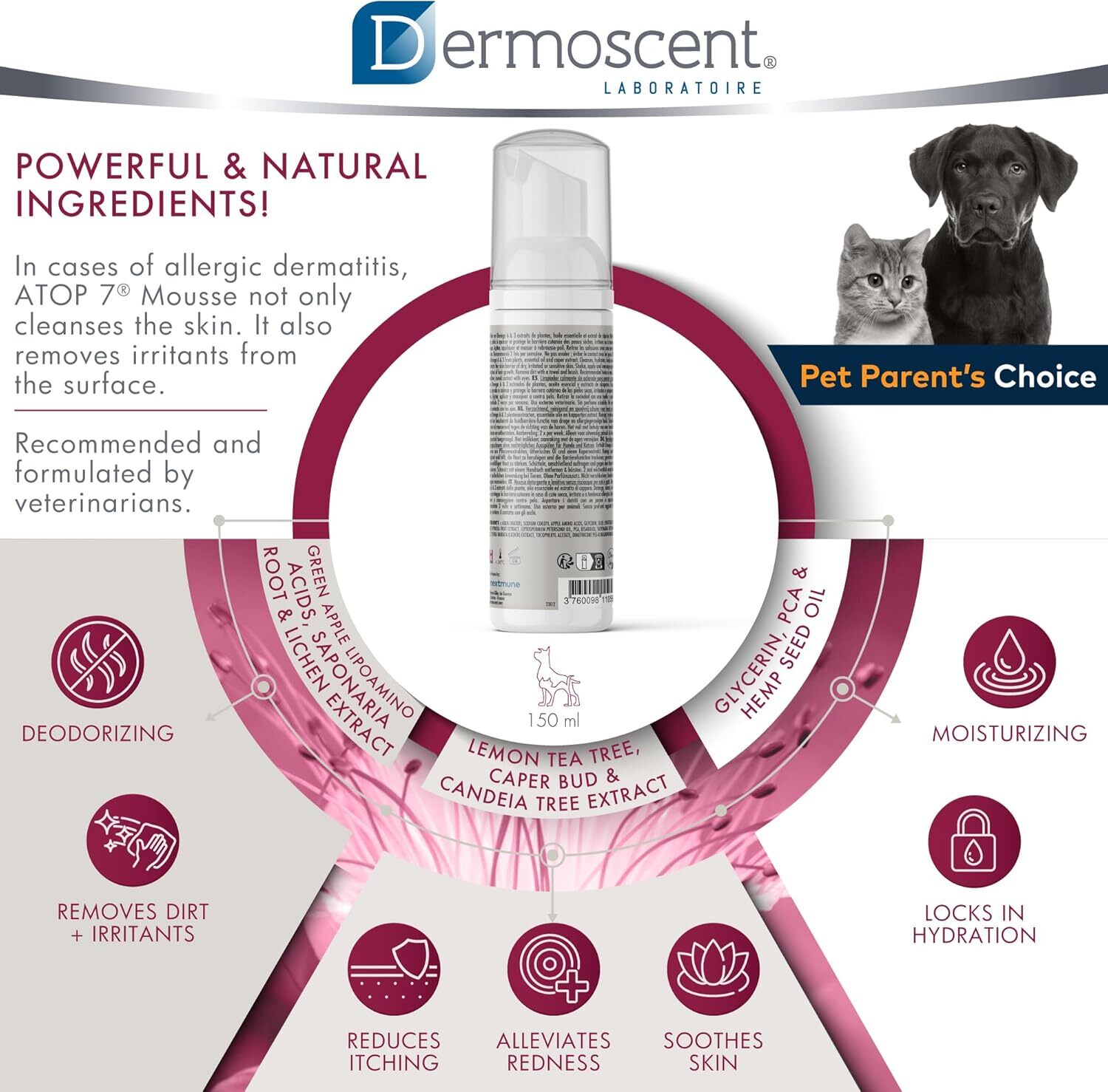 A Dermoscent ATOP 7 Mousse egy kíméletes, leöblítést nem igénylő tisztító és nyugtató hatású hab kutyáknak és macskáknak. Segít eltávolítani a szennyeződéseket és allergéneket a bőrről és a bundáról, csökkenti az irritációt és a viszketést, hidratálja és védi a bőrt.
