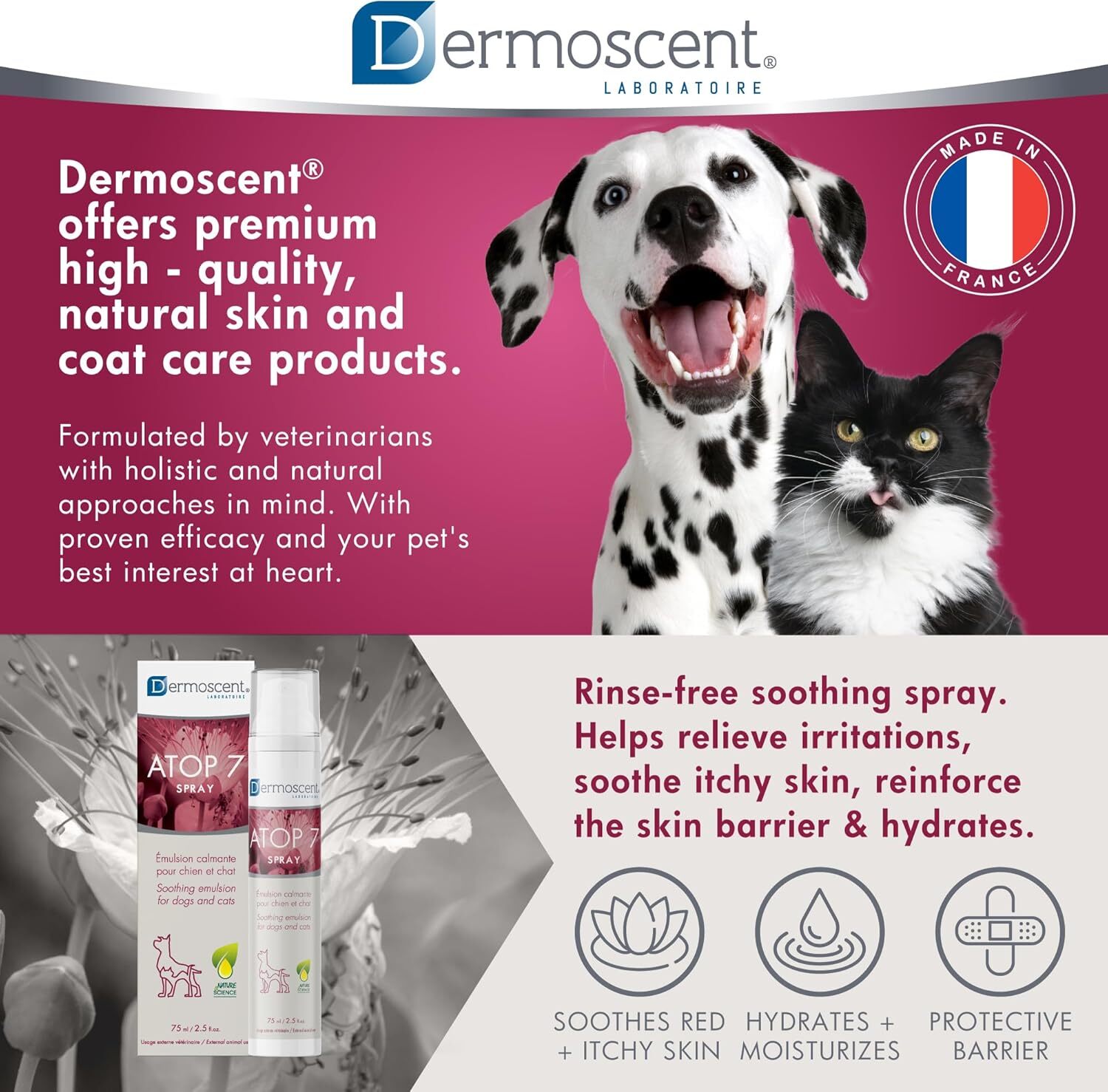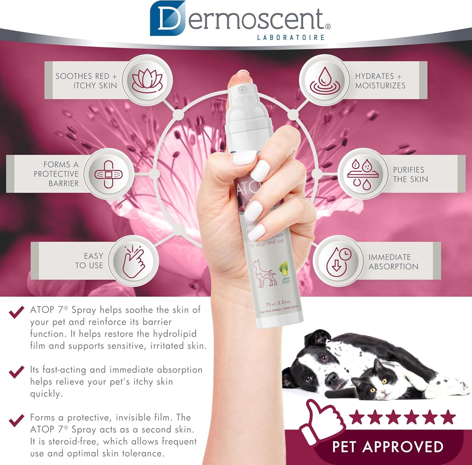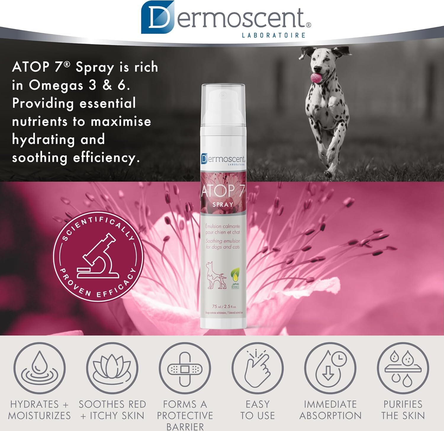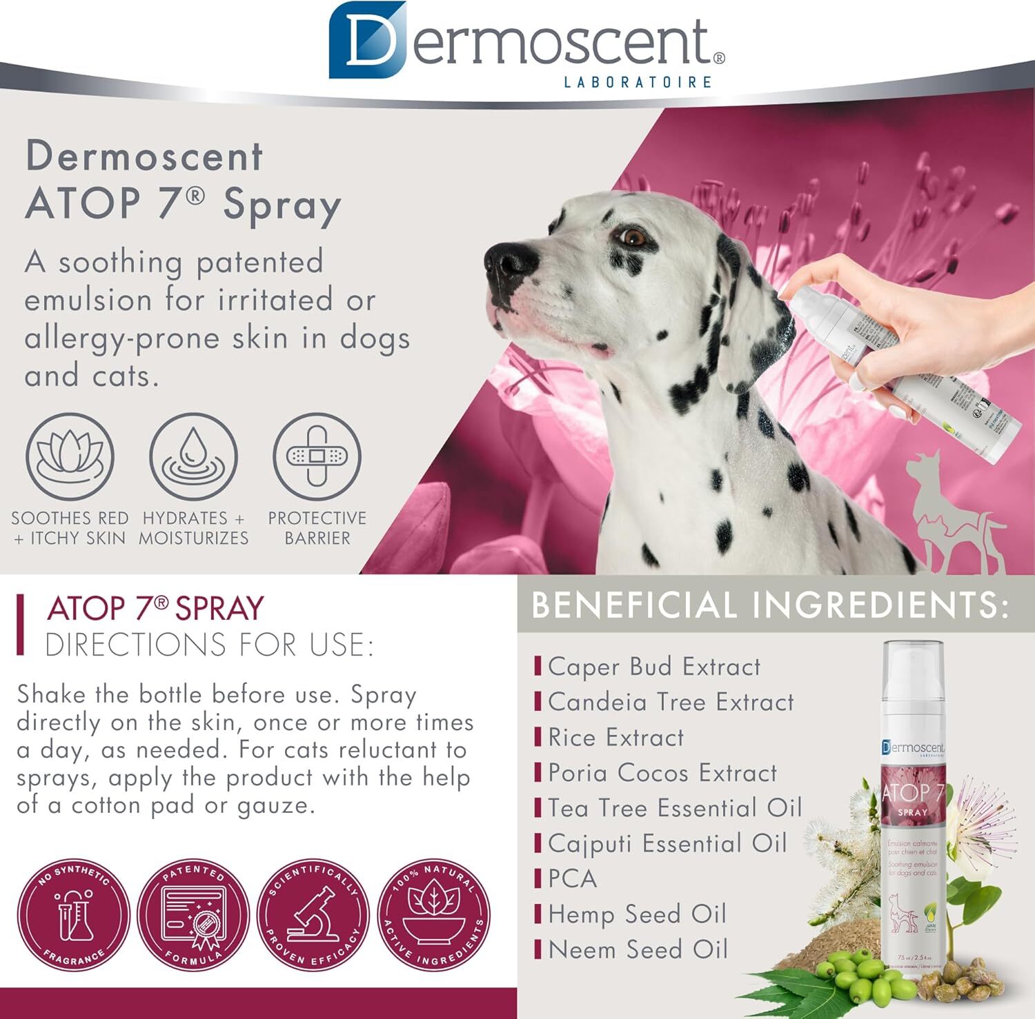 A Dermoscent ATOP 7 Spray egy szabadalmaztatott, természetes összetevőket tartalmazó, nyugtató és regeneráló bőrápoló spray kutyáknak és macskáknak. Csökkenti a viszketést, az irritációt és segít megőrizni a bőr hidratáltságát, miközben láthatatlan védőfilmet képez a bőr felszínén.
