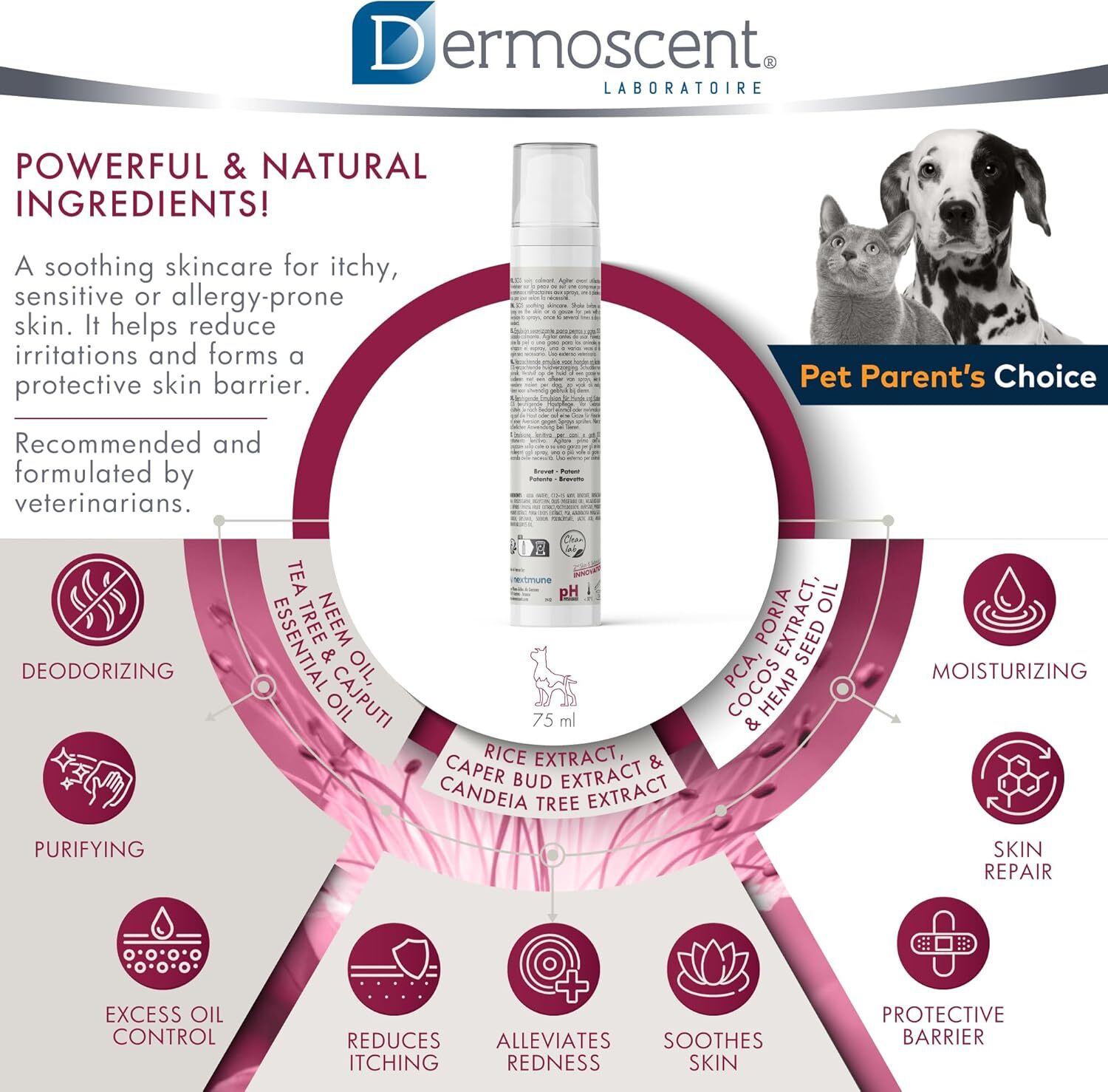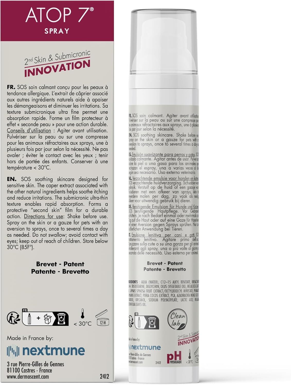 A Dermoscent ATOP 7 Spray kettős innovációt ötvöz: természetes, nyugtató hatóanyagokat és egy szabadalmaztatott „második bőr” technológiát, amely védőréteget képez a bőrön anélkül, hogy elzárná a pórusokat vagy a bőr lélegzését. Szuperfinom, szubmikronos textúrája gyorsan felszívódik, azonnali komfortérzetet biztosít, és enyhíti a viszketést és irritációt. Segíti a bőr védőgátjának regenerációját, helyreállítja a hidratáltságot és véd az irritáló külső hatásokkal szemben.