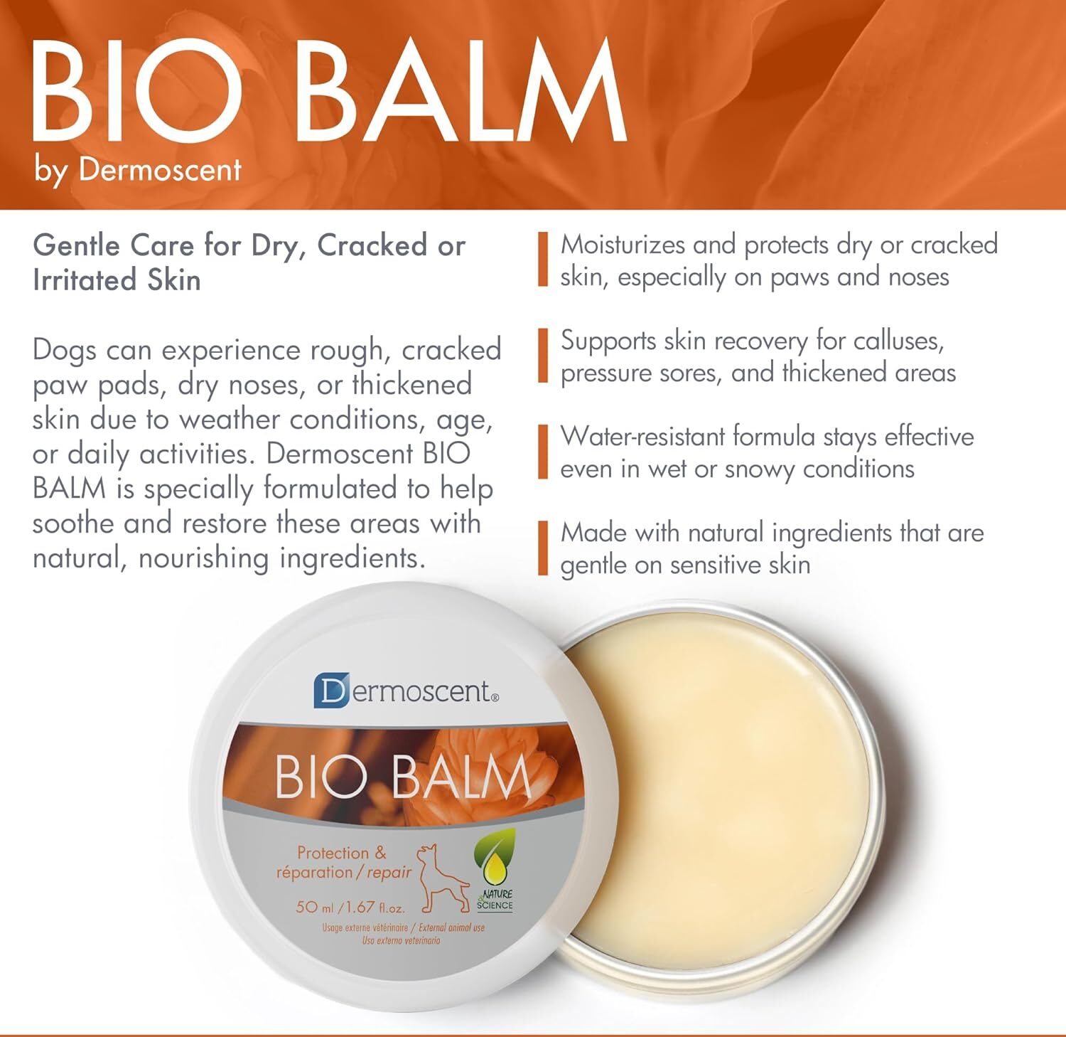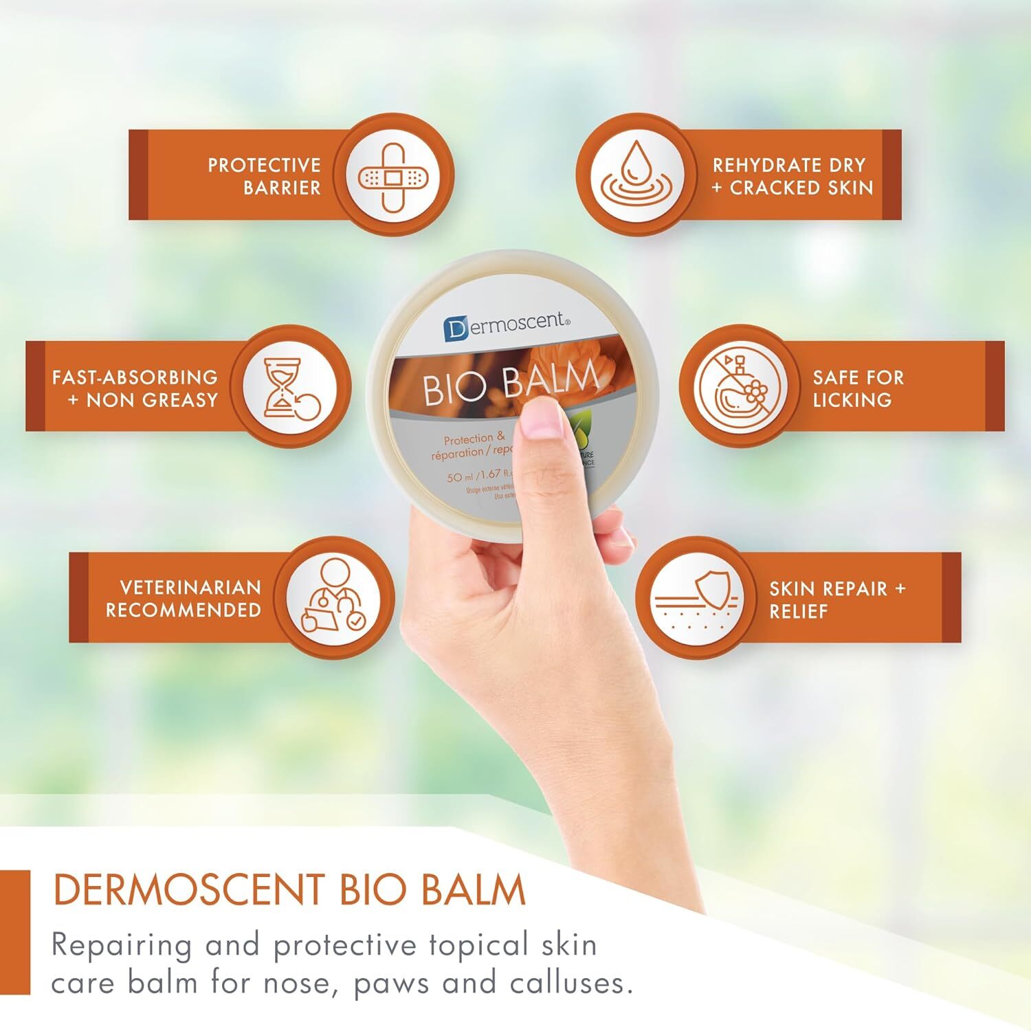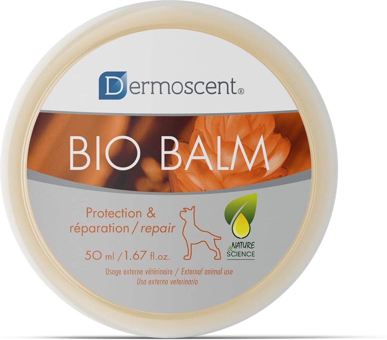 A Dermoscent BIO BALM természetes, bio minősítésű összetevőkből készült balzsam, amely táplálja, védi és regenerálja a kutyák száraz vagy sérült bőrét, orrát és tappancsait. Kifejezetten a megvastagodott, repedezett, száraz bőr helyreállítására fejlesztették ki, valamint segít enyhíteni a mancsok közti irritációt és csökkenti a nem fertőzött bőrkeményedések (pl. könyöknyomási pontokon) méretét. Vízálló textúrájának köszönhetően a balzsam mindig megbízható védelmet nyújt – akár hóban, akár sporttevékenység közben is.