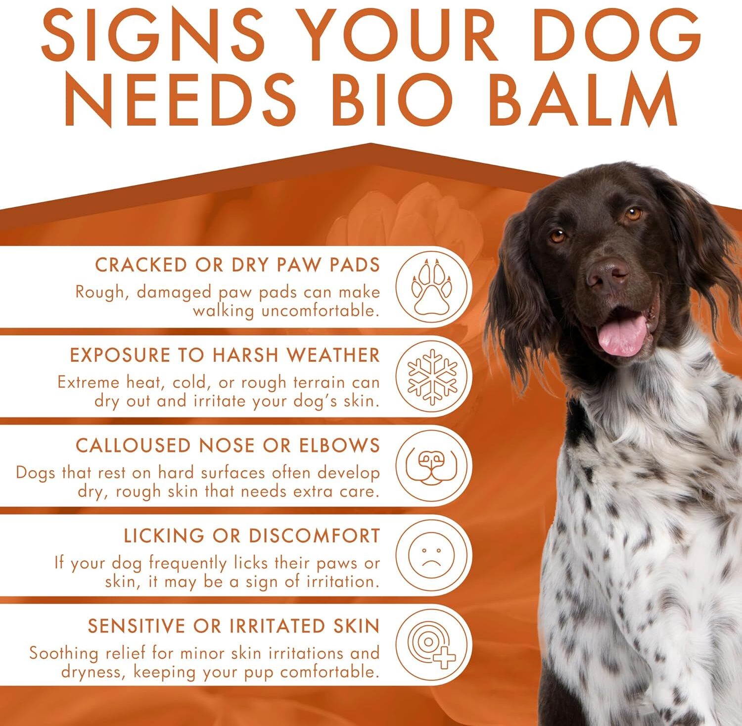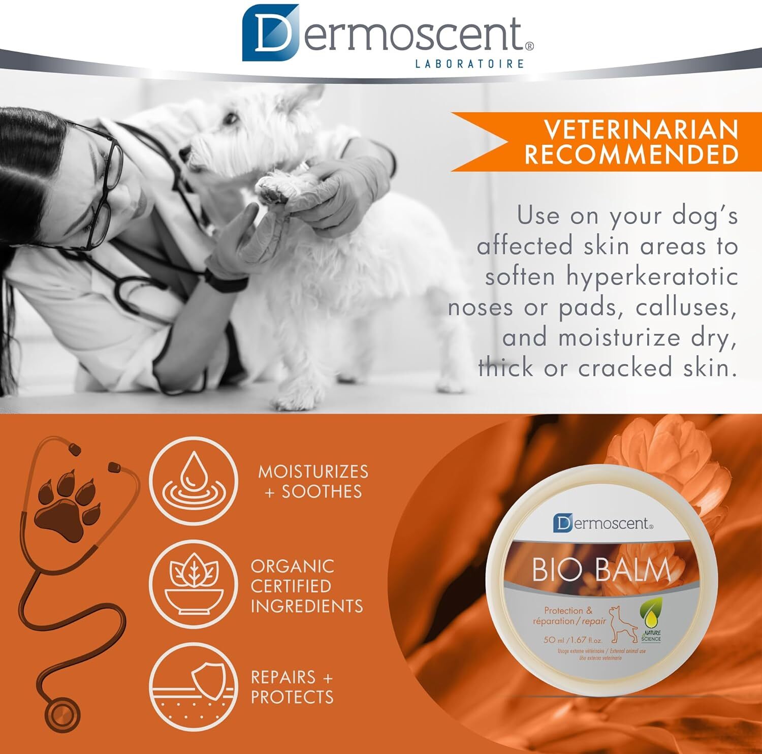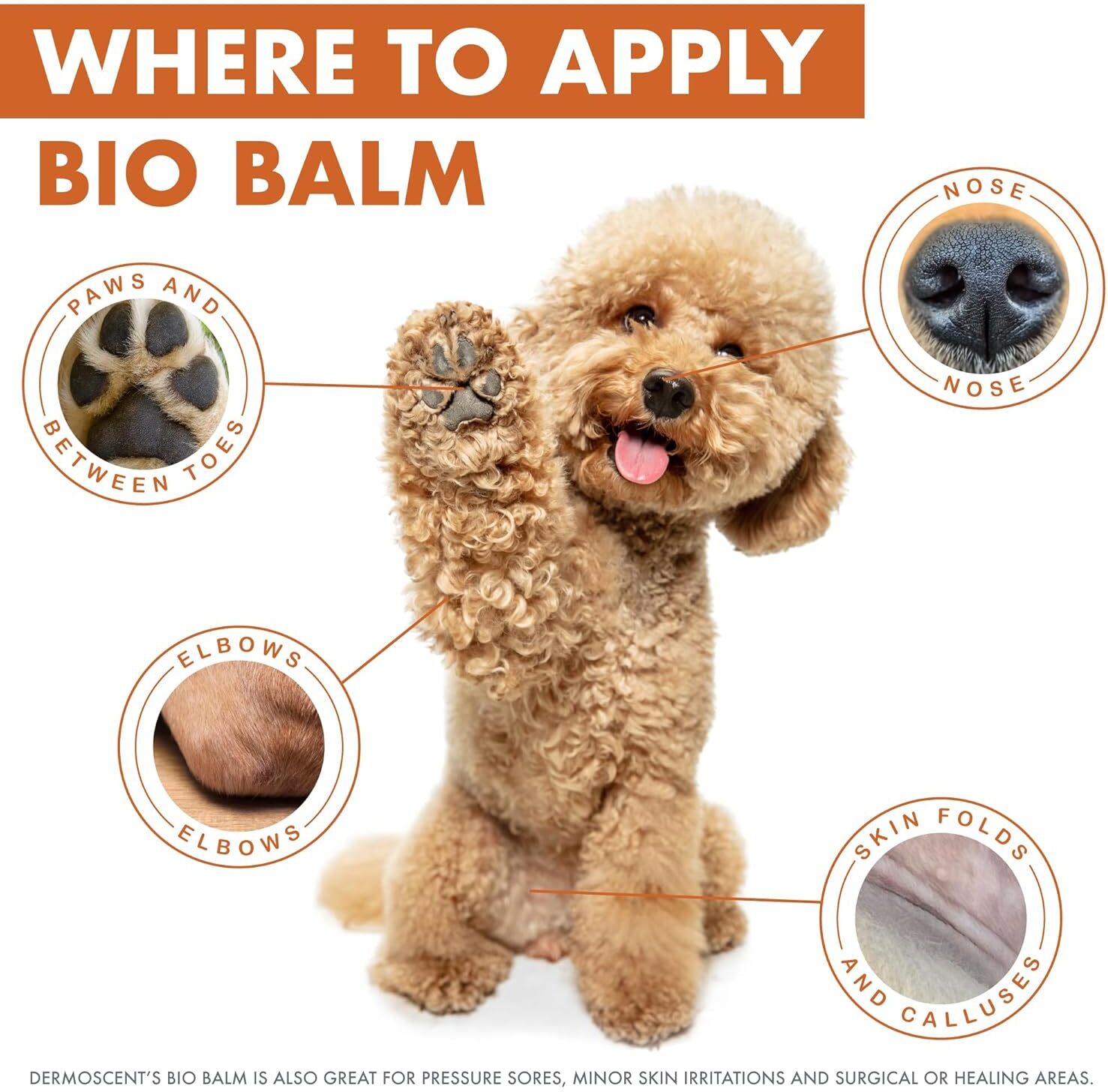 A Dermoscent BIO BALM természetes, bio minősítésű összetevőkből készült balzsam, amely táplálja, védi és regenerálja a kutyák száraz vagy sérült bőrét, orrát és tappancsait. Kifejezetten a megvastagodott, repedezett, száraz bőr helyreállítására fejlesztették ki, valamint segít enyhíteni a mancsok közti irritációt és csökkenti a nem fertőzött bőrkeményedések (pl. könyöknyomási pontokon) méretét. Vízálló textúrájának köszönhetően a balzsam mindig megbízható védelmet nyújt – akár hóban, akár sporttevékenység közben is.