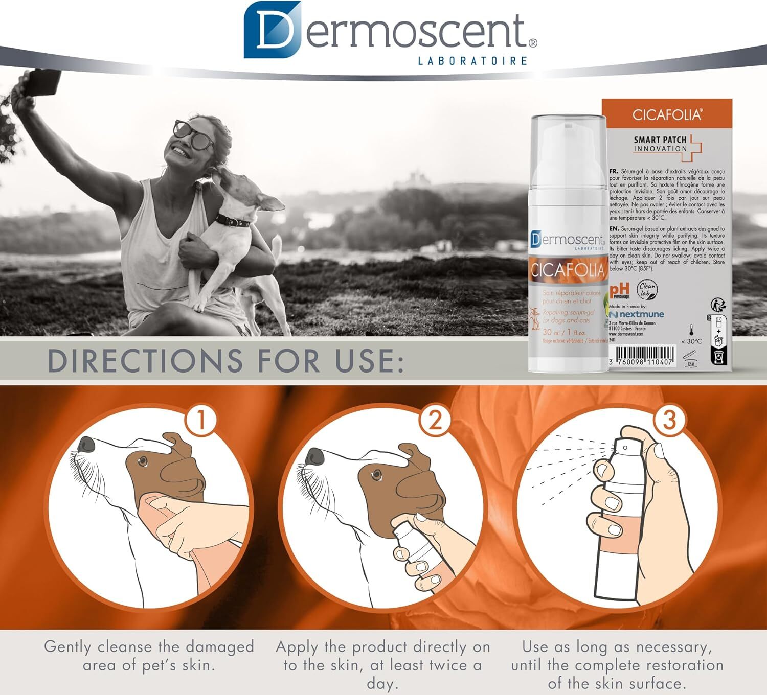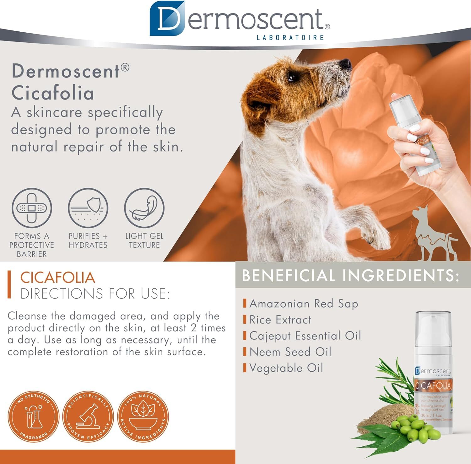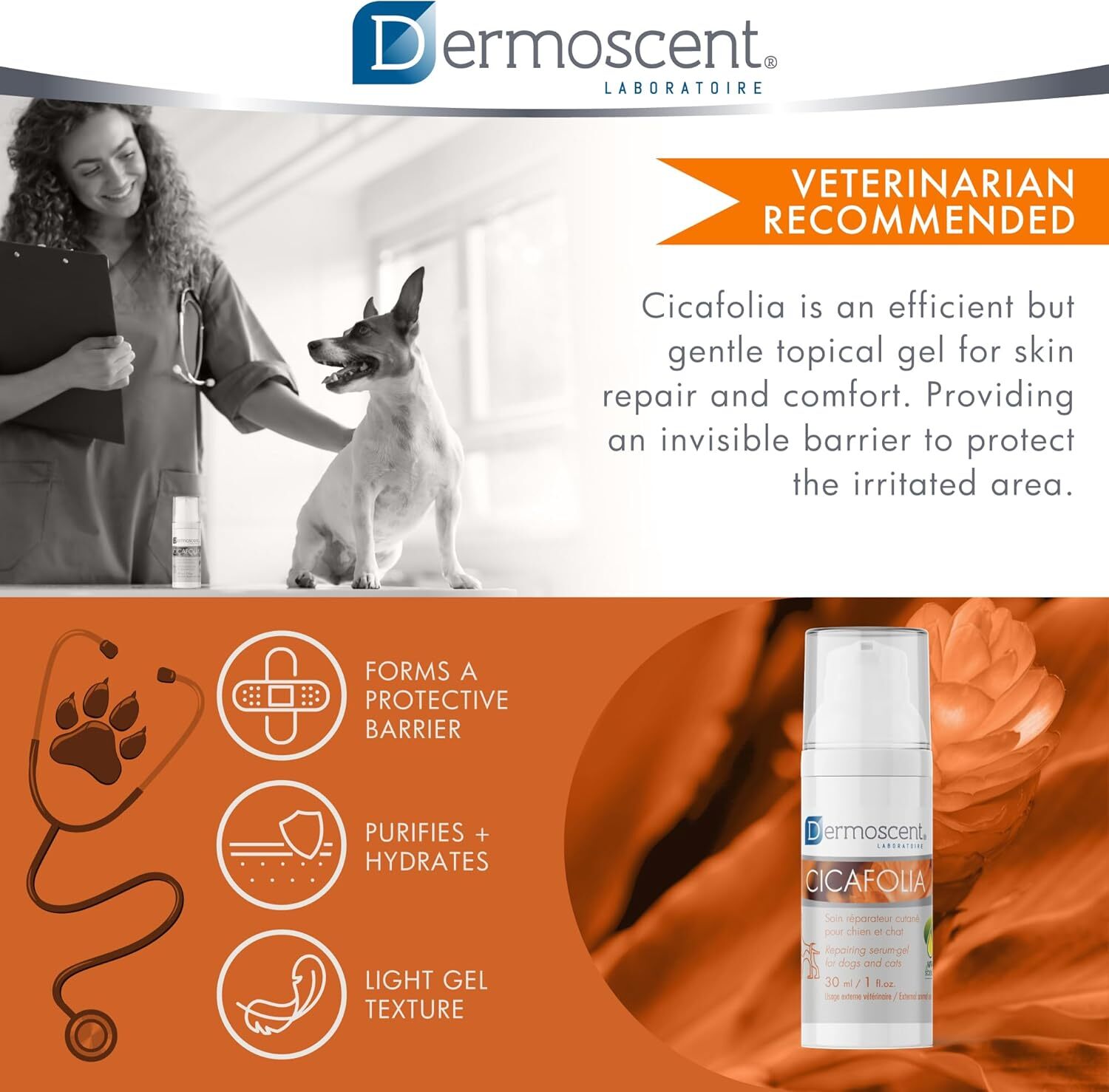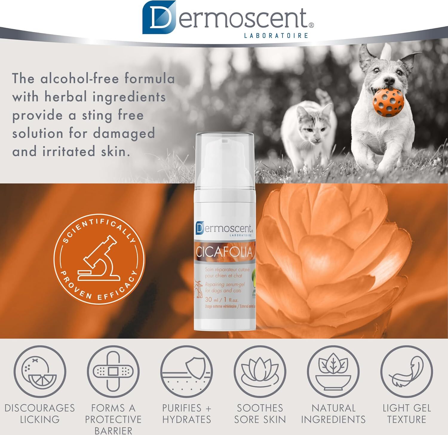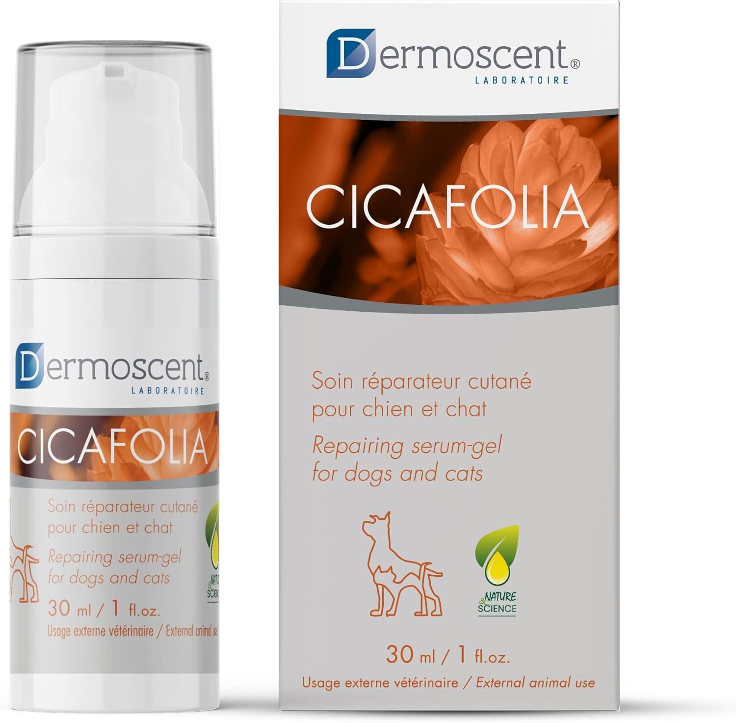 A Dermoscent Cicafolia egy természetes összetevőkből készült, regeneráló hatású gél-szérum kutyák és macskák számára. Tisztítja a sérült területeket, miközben láthatatlan védőréteget képez, és keserű ízével megakadályozza a lenyalást. Hidratáló hatásával segíti a bőr természetes gyógyulási folyamatát.