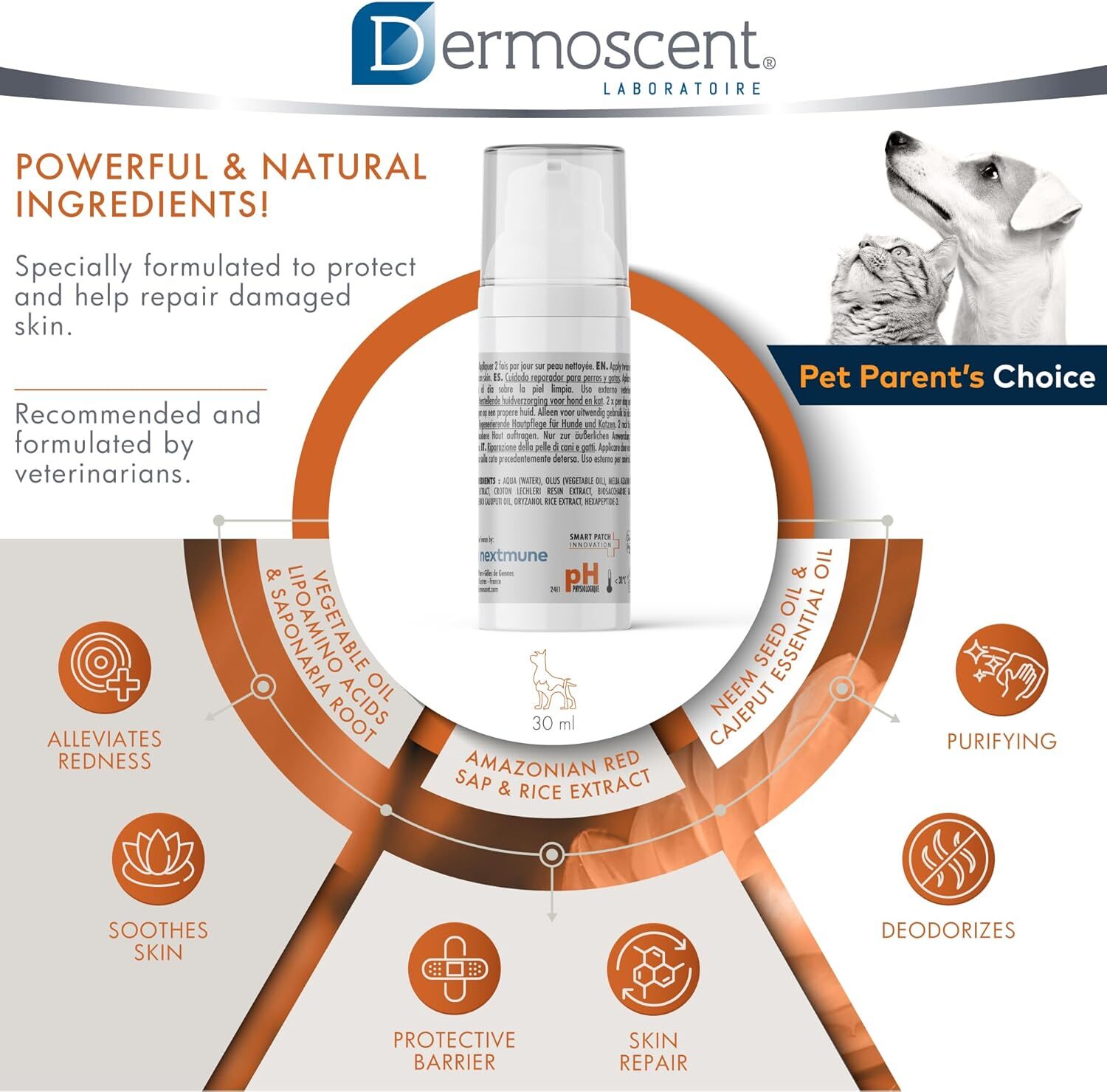 A Dermoscent Cicafolia egy regeneráló, bőrbarát gél-szérum, amely támogatja a bőr természetes helyreállítását kisebb sérülések, horzsolások, égési nyomok vagy műtéti sebek után. Egyedülálló védőfilm-hatásának köszönhetően átlátszó, nem záró réteget képez a bőrön, amely védi a sérült területet, ugyanakkor nem akadályozza az állat mozgását. Könnyű, hűsítő textúrája gyorsan beszívódik, hidratálja, tisztítja és nyugtatja a bőrt, miközben a növényi eredetű poliszacharidok védelmet nyújtanak a külső irritáló hatásokkal szemben. A termék keserű íze természetes módon akadályozza meg, hogy az állat lenyalja a készítményt, így biztonságosan használható kutyákon és macskákon egyaránt.