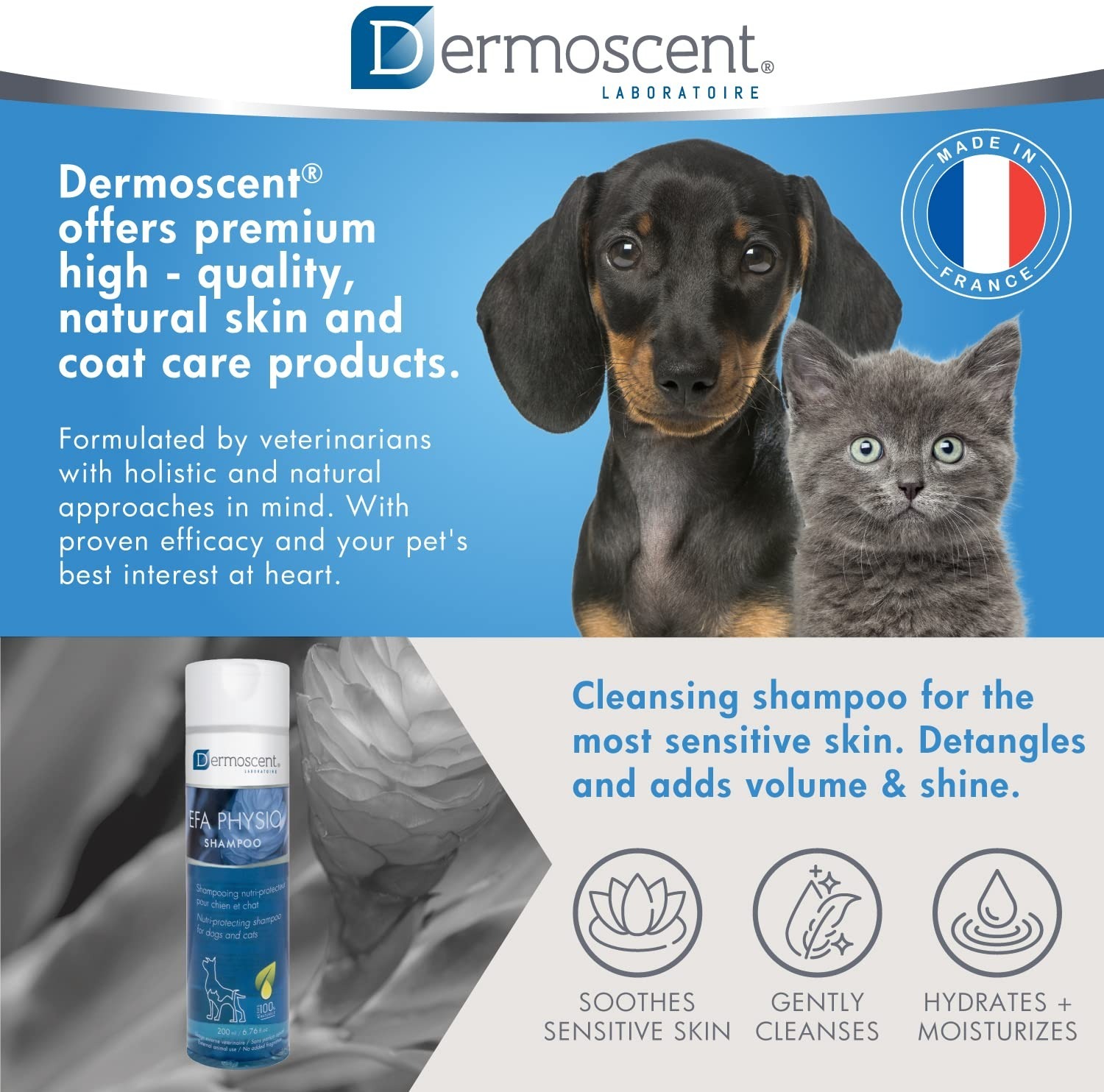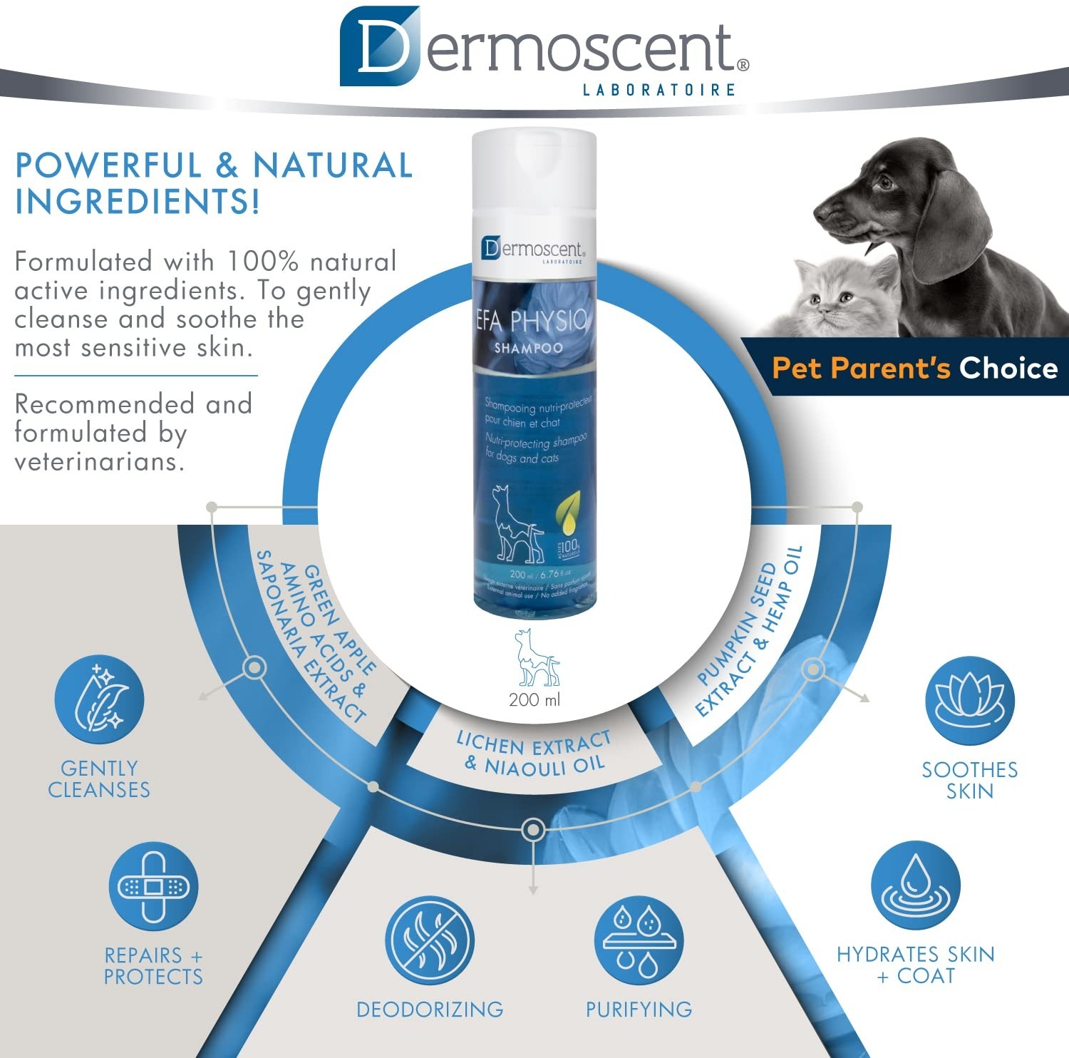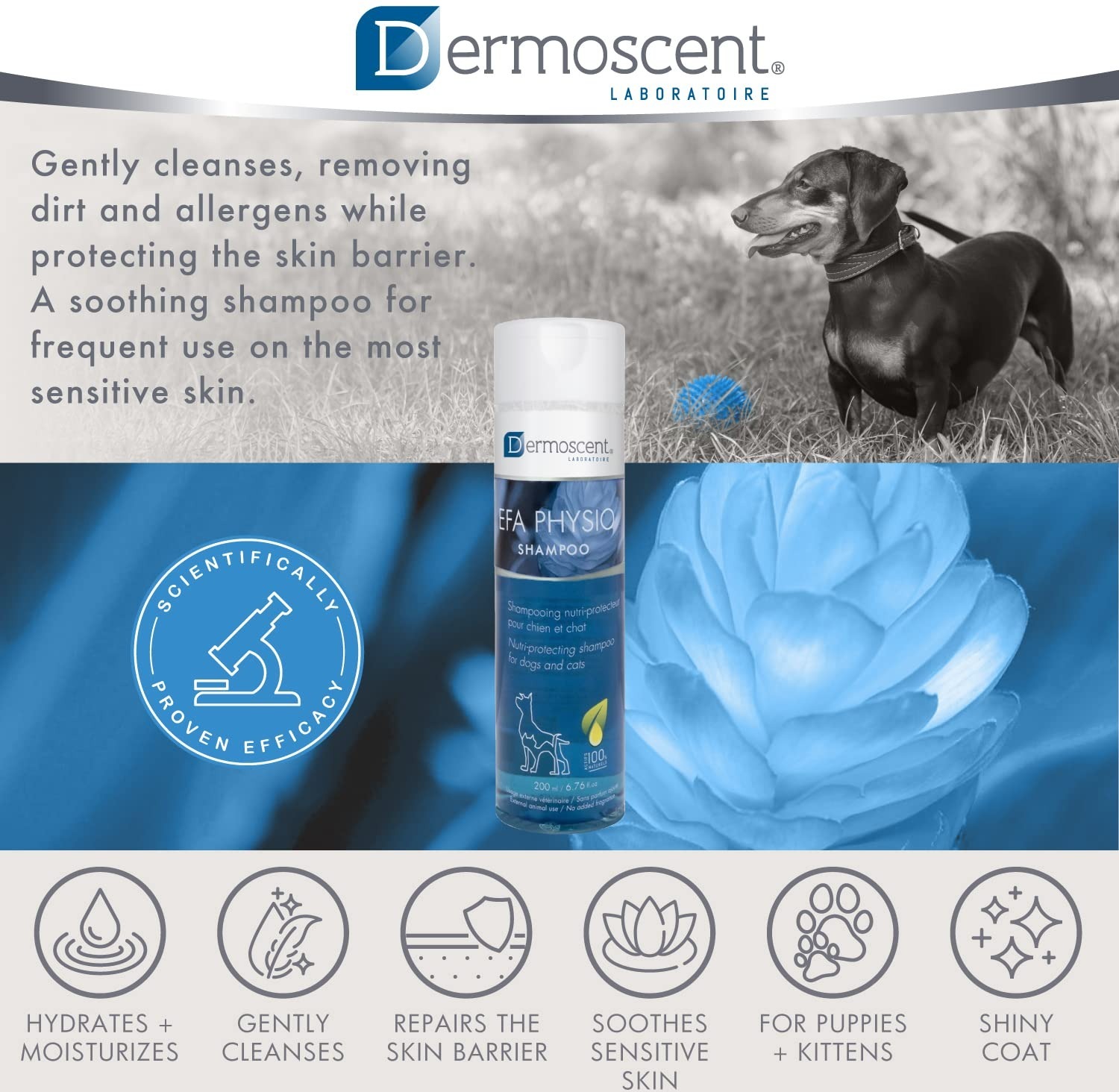 A Dermoscent EFA Physio Shampoo kíméletes, szappanmentes sampon kutyáknak és macskáknak, amely természetes összetevőivel tisztítja, hidratálja és nyugtatja a bőrt, miközben fényessé és illatossá varázsolja a bundát.
