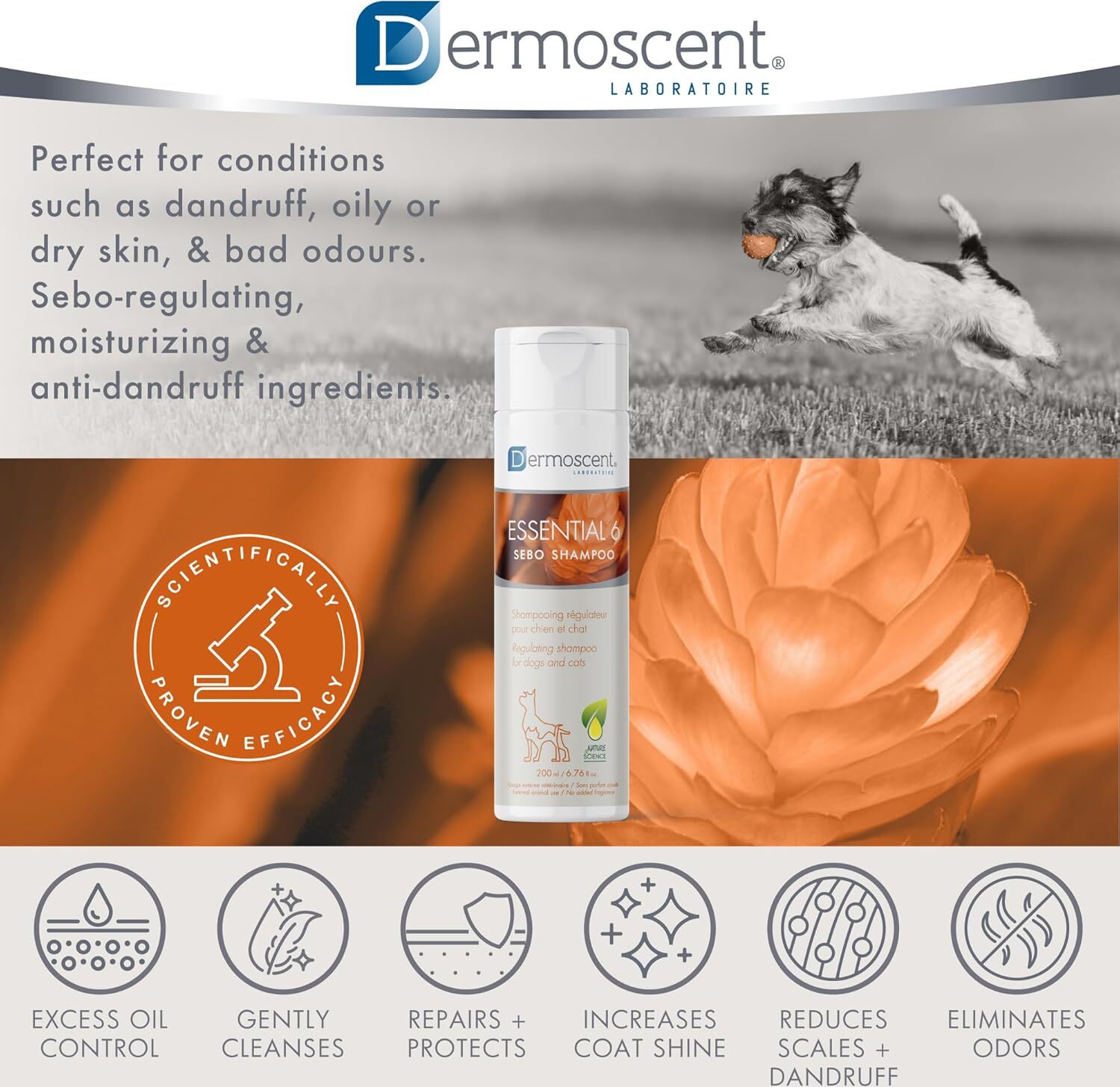 A Dermoscent Essential 6 Sebo Shampoo egy természetes összetevőkből készült szappanmentes sampon kutyáknak és macskáknak. Kíméletesen tisztít, szabályozza a faggyútermelést, csökkenti a korpát és megszünteti a kellemetlen szagokat, a szőrzetet pedig fényesebbé és egészségesebbé teszi.