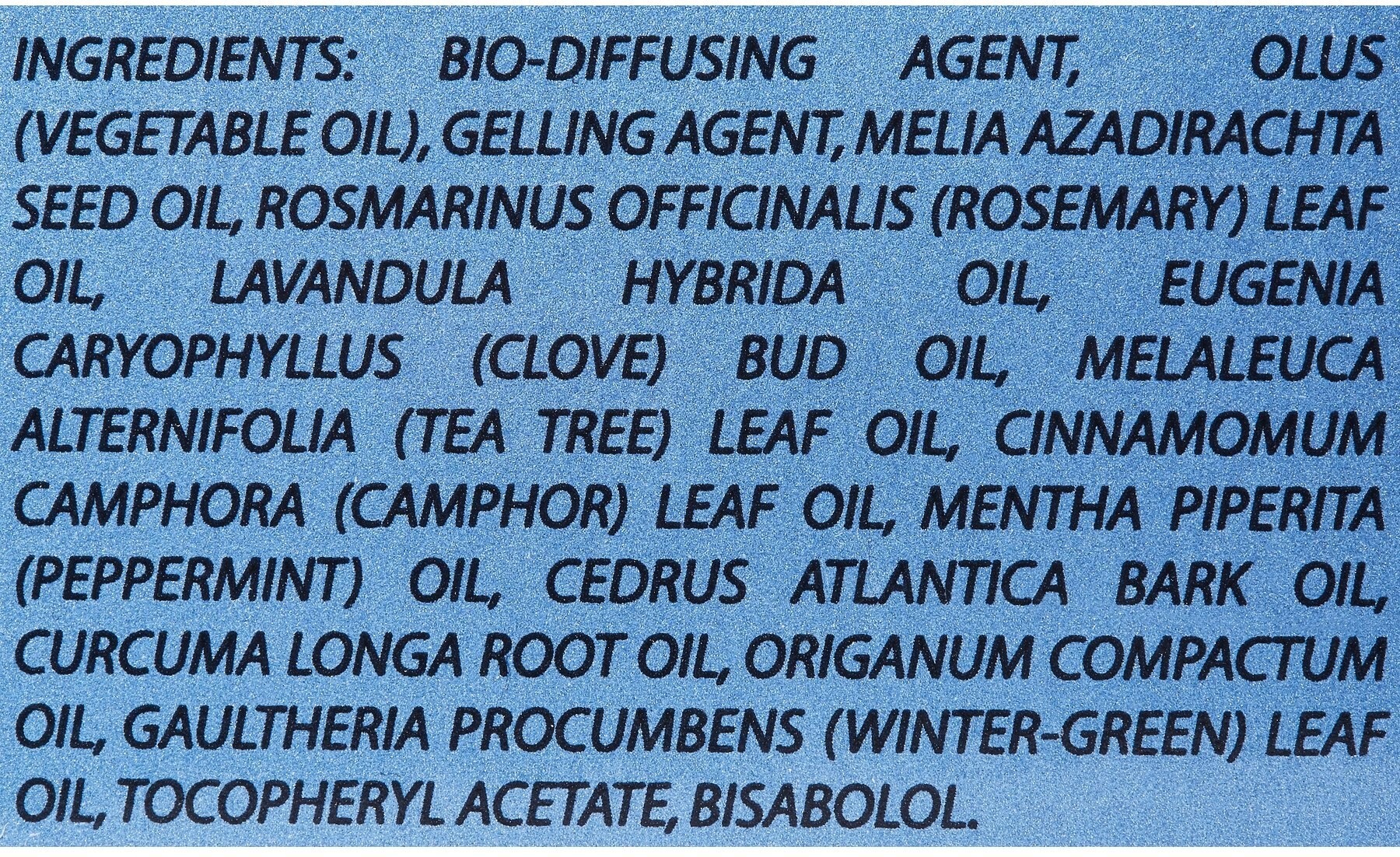 Összetétel: Növényi olajok és gélképző anyagok: neemfa olaj, rozmaringolaj, levendulaolaj, szegfűszegolaj, teafaolaj, kámfor, borsmentaolaj, atlaszcédrus olaj, kurkumaolaj, oregánóolaj, kúszó fajdbogyó (wintergreen) olaj, tokoferol-acetát (E-vitamin), bisabolol.