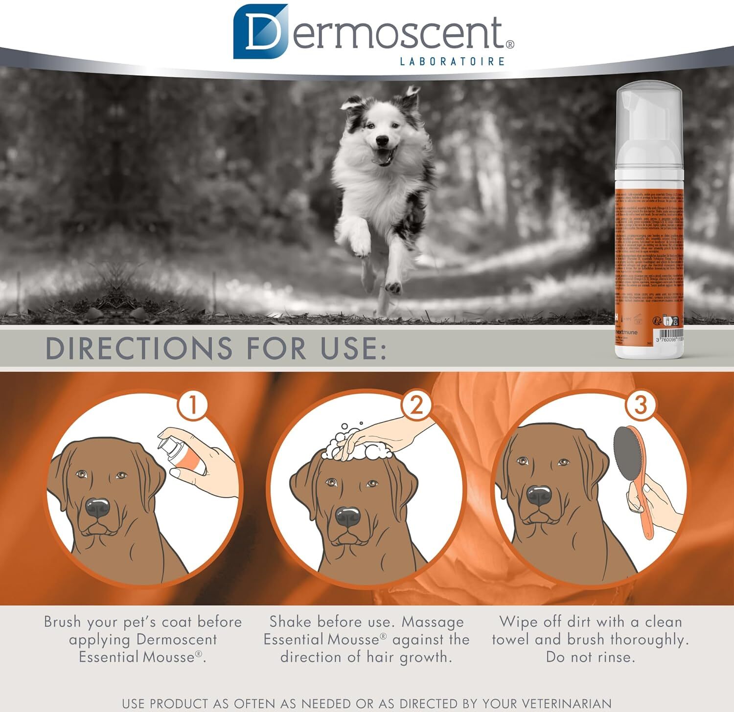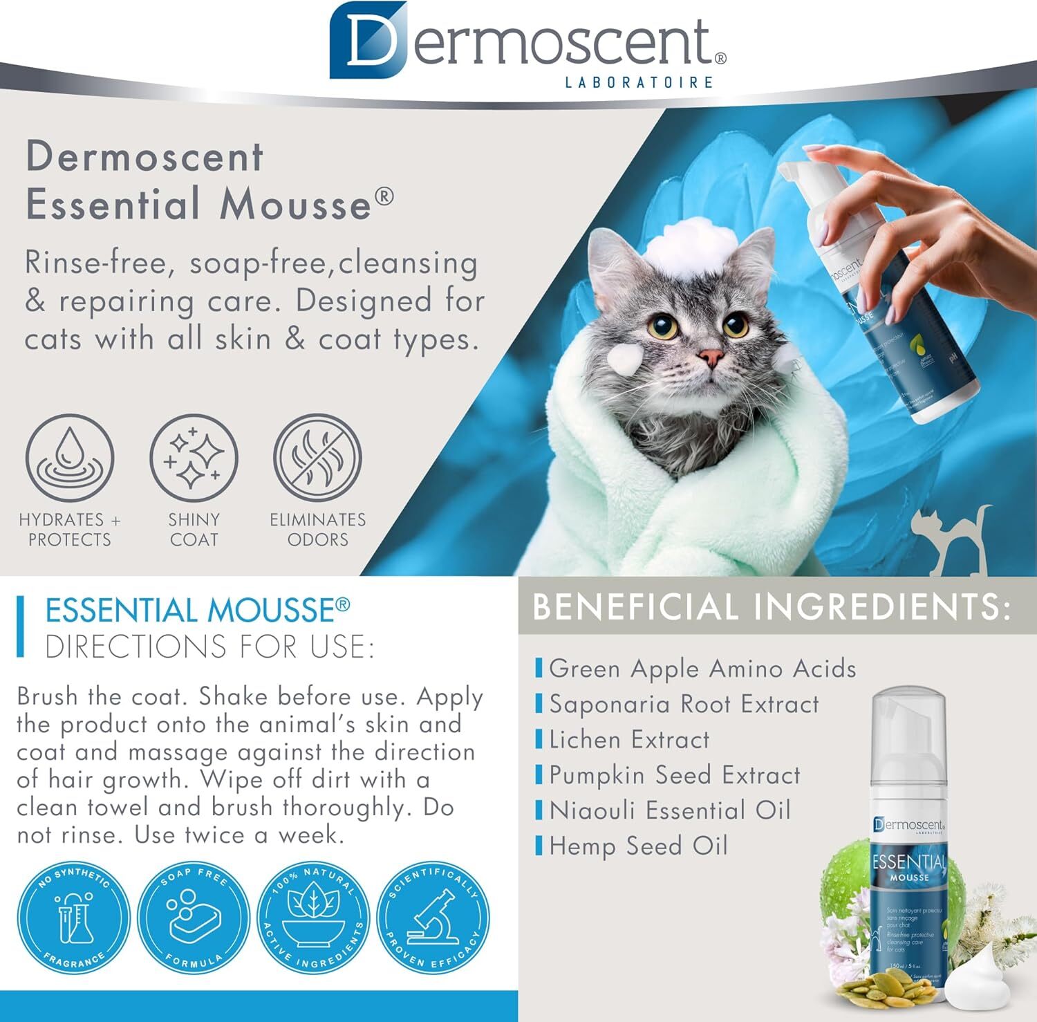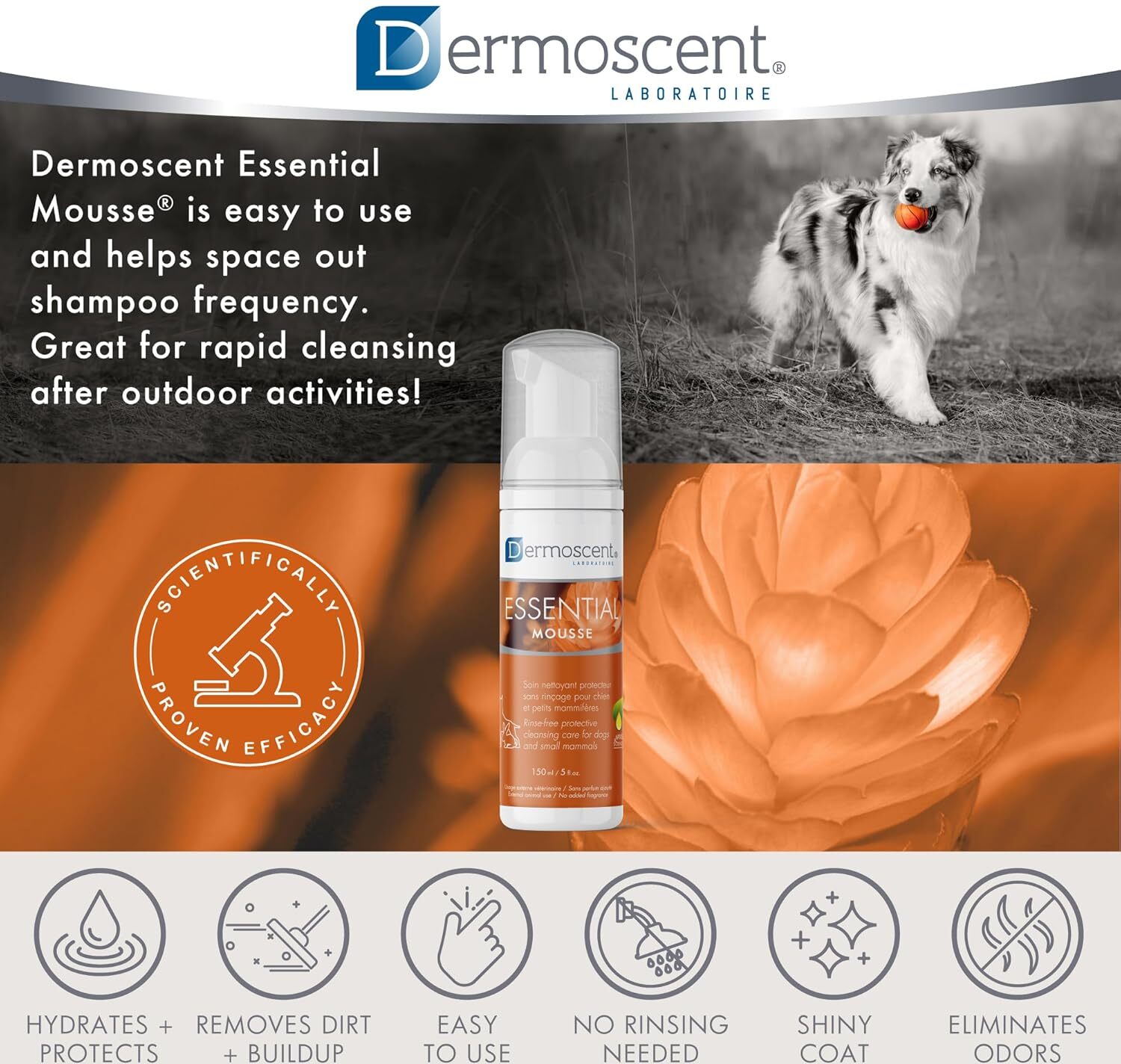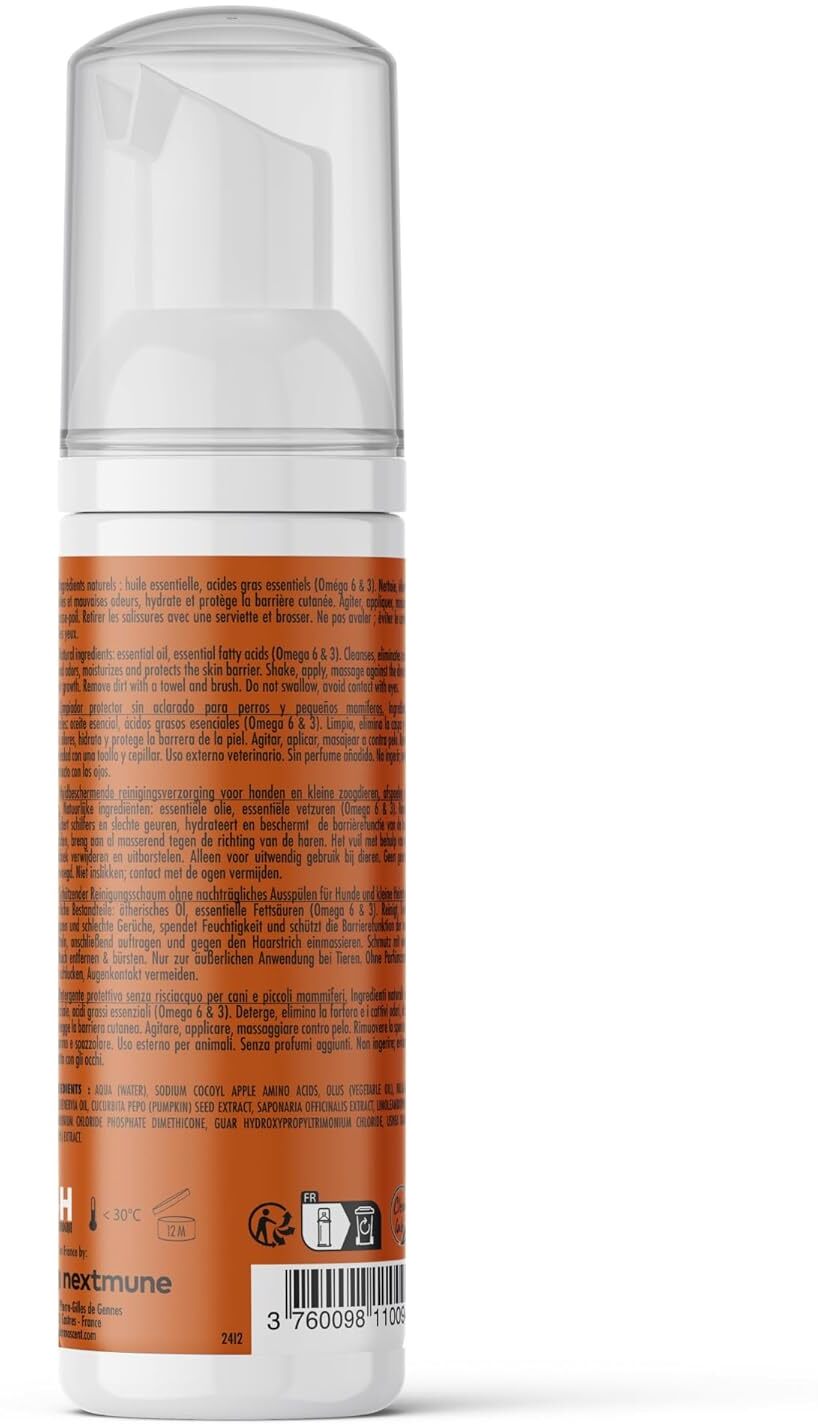A Dermoscent Essential Mousse egy praktikus, leöblítést nem igénylő tisztítóhab kutyák, macskák és kisemlősök (nyulak, görények, tengerimalacok, hörcsögök, patkányok, egerek stb.) számára. Kiváló megoldás azoknak az állatoknak, amelyek nem tűrik jól a fürdetést, vagy akiknek bőre és bundája extra ápolást igényel. Hatékonyan tisztítja a szennyeződéseket, eltávolítja a korpát és a kellemetlen szagokat, miközben fényessé, puha tapintásúvá és kellemes illatúvá teszi a bundát.