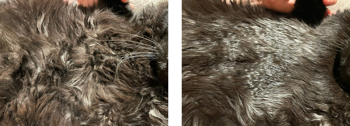 - Fújd a szőrzetre, különösen a gubancos területekre, majd fésüld át.