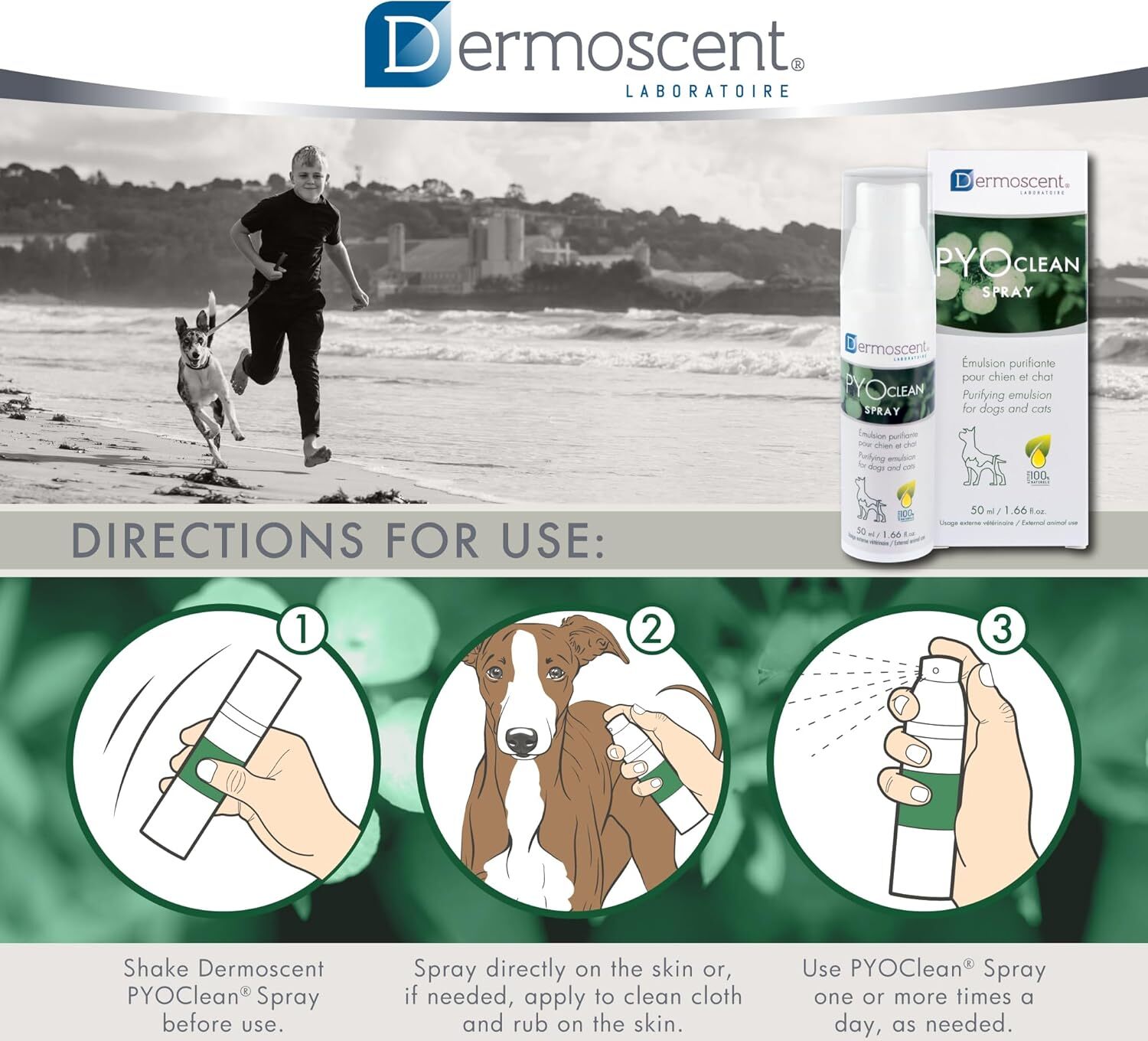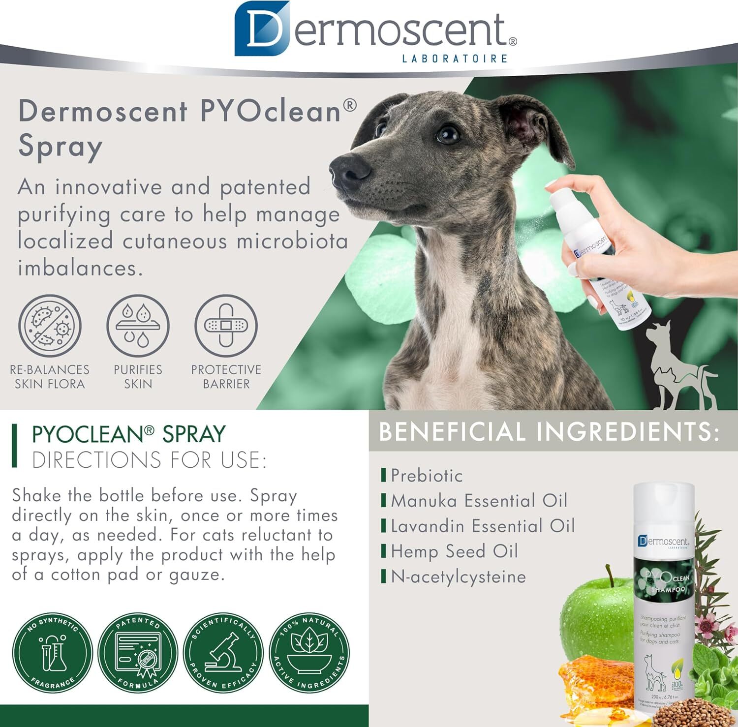 A Dermoscent PYOclean Spray egyedülálló, szabadalmaztatott bőrtisztító és bőregyensúlyt helyreállító spray, amelyet a helyileg jelentkező bőrflóra-egyensúlyzavarok (például felszínes pyoderma, Malassezia-dermatitis, pododermatitis) kiegészítő kezelésére fejlesztettek ki. A 100%-ban természetes eredetű hatóanyagokat tartalmazó emulzió fertőtleníti, nyugtatja és helyreállítja a bőr mikrobiális egyensúlyát, miközben támogatja a bőr természetes védekezőképességét a benne található prebiotikum révén. Az eredeti, tapadó textúra biztosítja, hogy a spray masszírozás nélkül is a helyén maradjon, tartós védőréteget képezve az érintett területen.