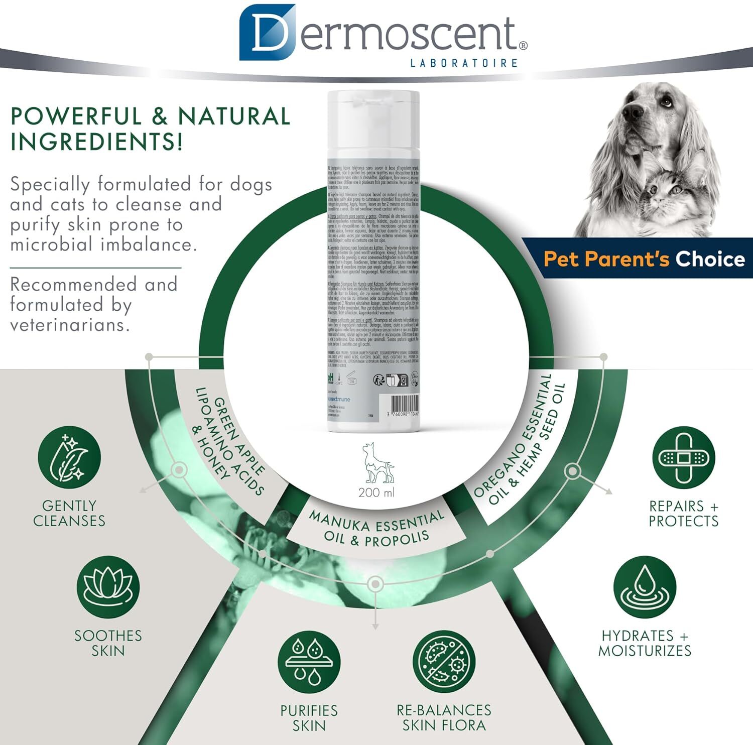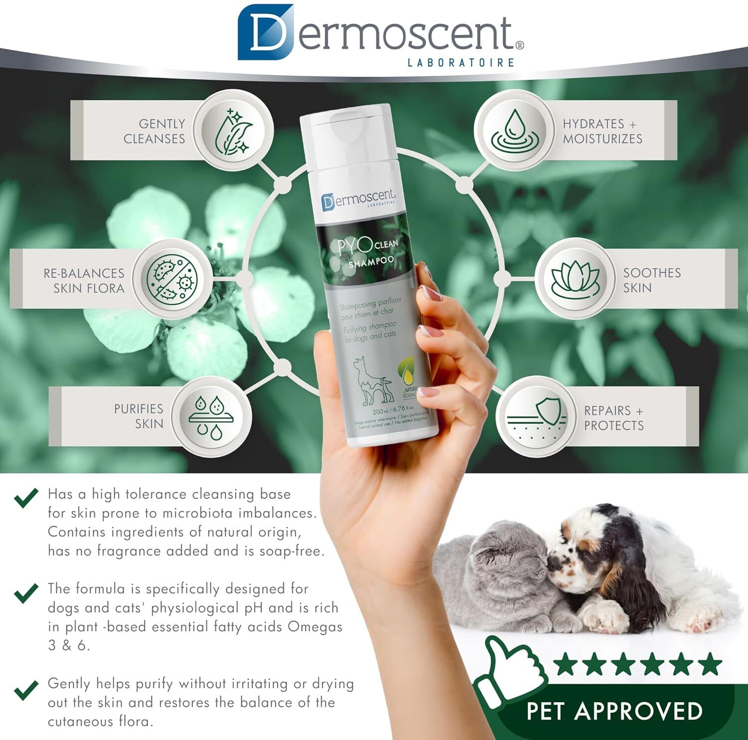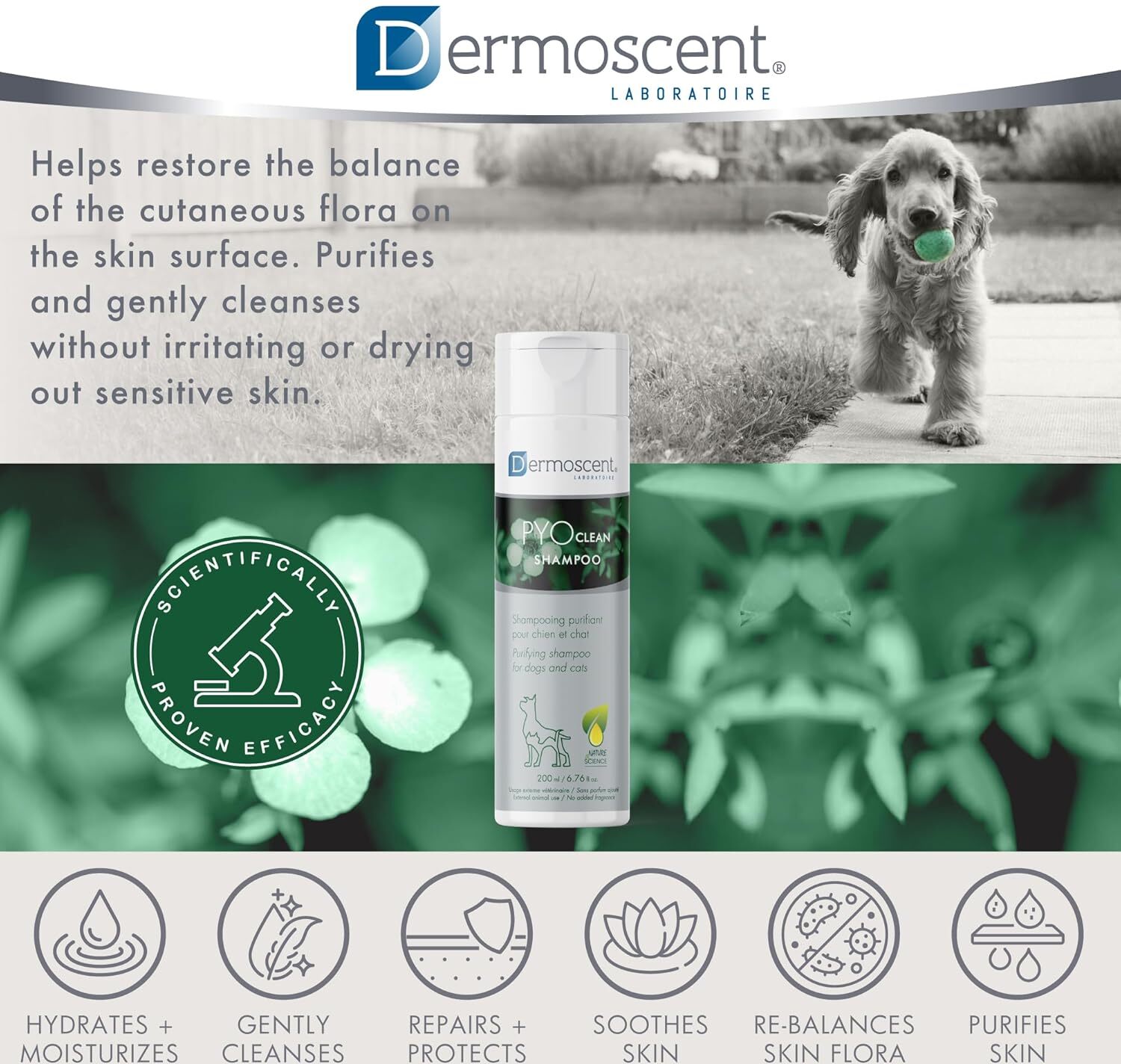 A Dermoscent PYOclean Shampoo egy természetes eredetű, fertőtlenítő hatású sampon kutyák és macskák számára. Kíméletesen tisztít, segít helyreállítani a bőr mikroflórájának egyensúlyát, csökkenti a kellemetlen szagokat, miközben megőrzi a bőr hidratáltságát.