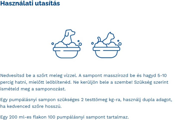 Adagolás: egy pumpálásnyi sampon szükséges két testtömegkilogrammonként. Hosszú szőrű állatok esetén dupla adag használata javasolt. Egy kétszáz milliliteres flakon száz pumpálásnyi sampont tartalmaz.