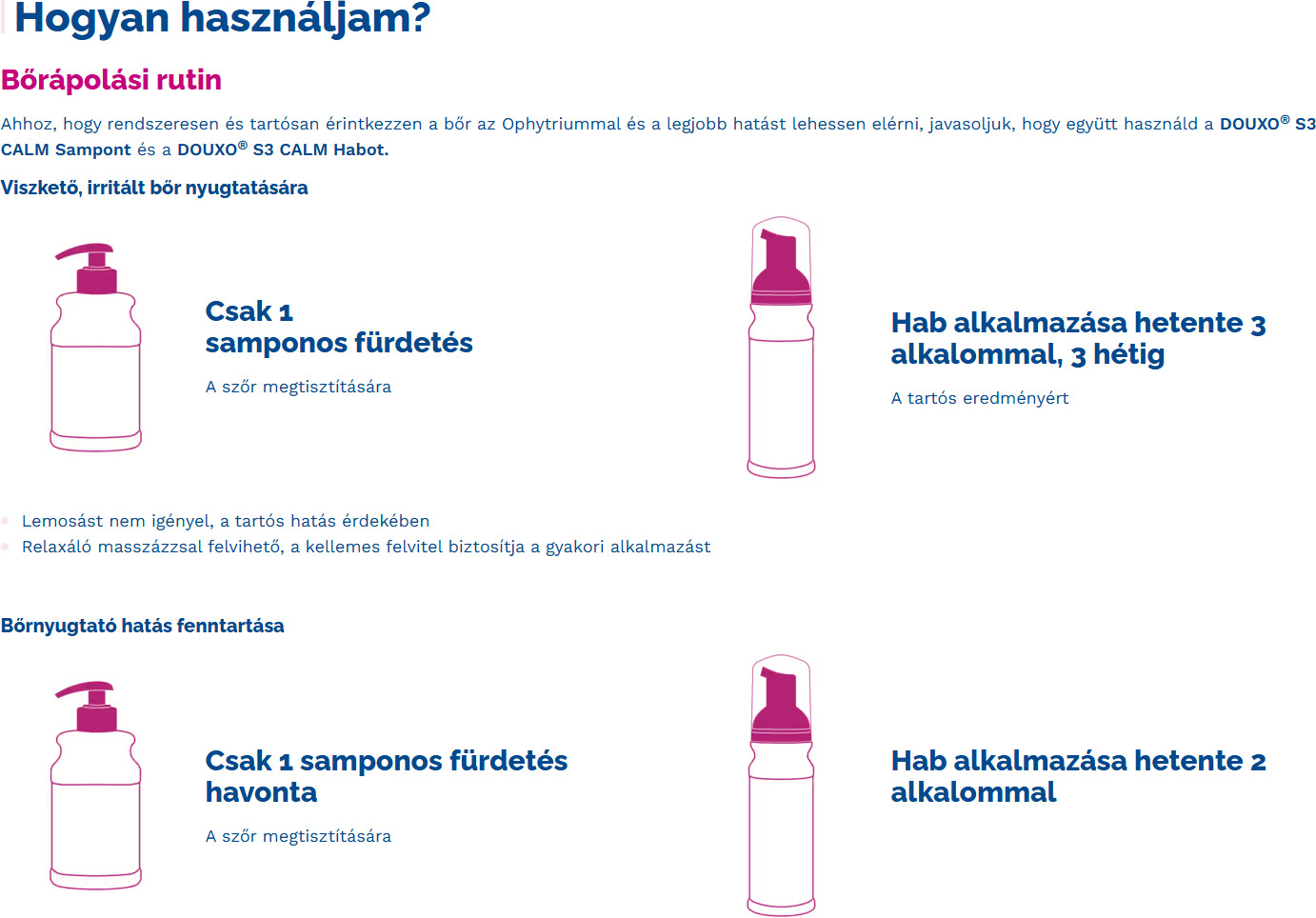 A tartós és optimális eredmény érdekében javasolt a Douxo S3 Calm sampont a Douxo S3 Calm habbal együtt alkalmazni, így a bőr rendszeresen és hosszabb ideig érintkezhet az Ophytriummal.