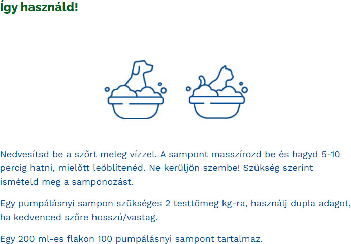 Adagolás: egy pumpálásnyi sampon szükséges két testtömegkilogrammonként. Hosszú vagy vastag szőr esetén dupla adag használata javasolt. Egy kétszáz milliliteres flakon száz pumpálásnyi sampont tartalmaz.