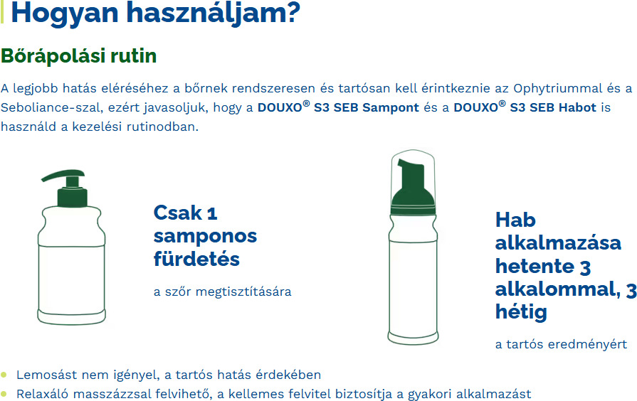Az optimális hatás érdekében a bőrnek rendszeresen és tartósan kell érintkeznie az Ophytriummal és a Seboliance-szal, ezért javasolt a Douxo S3 Seb sampon és a Douxo S3 Seb hab együttes alkalmazása.