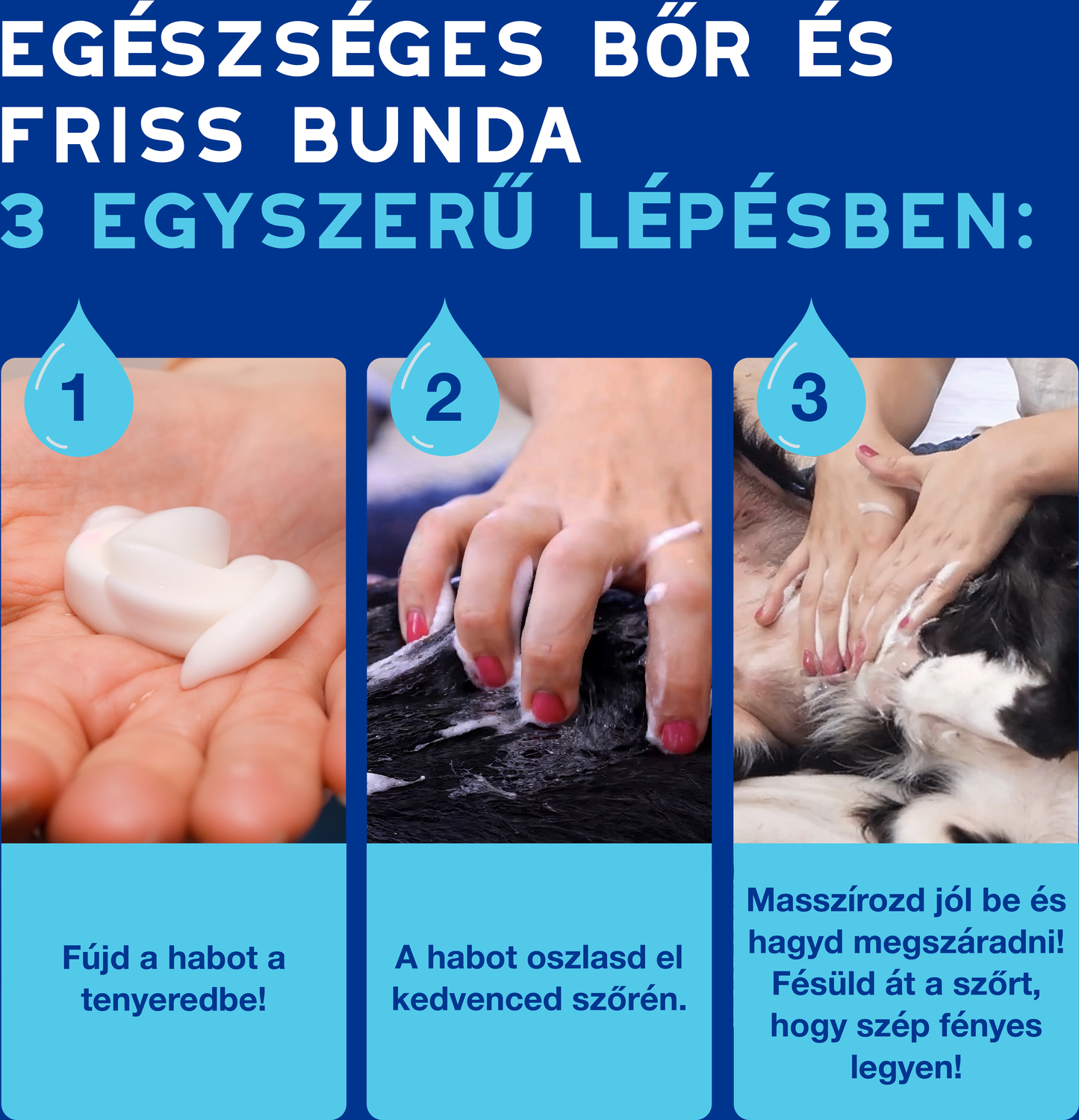 A hab biztonságosan tisztítja és felfrissíti a szőrzetet, puhává, ragyogóvá és jó illatúvá teszi a bundát. Kényelmes hab állagának köszönhetően az ápolás egyszerűen, gyorsan és biztonságosan elvégezhető víz használata nélkül, így ideális megoldás utazáskor, séták után vagy a fürdetések közötti időszakban.