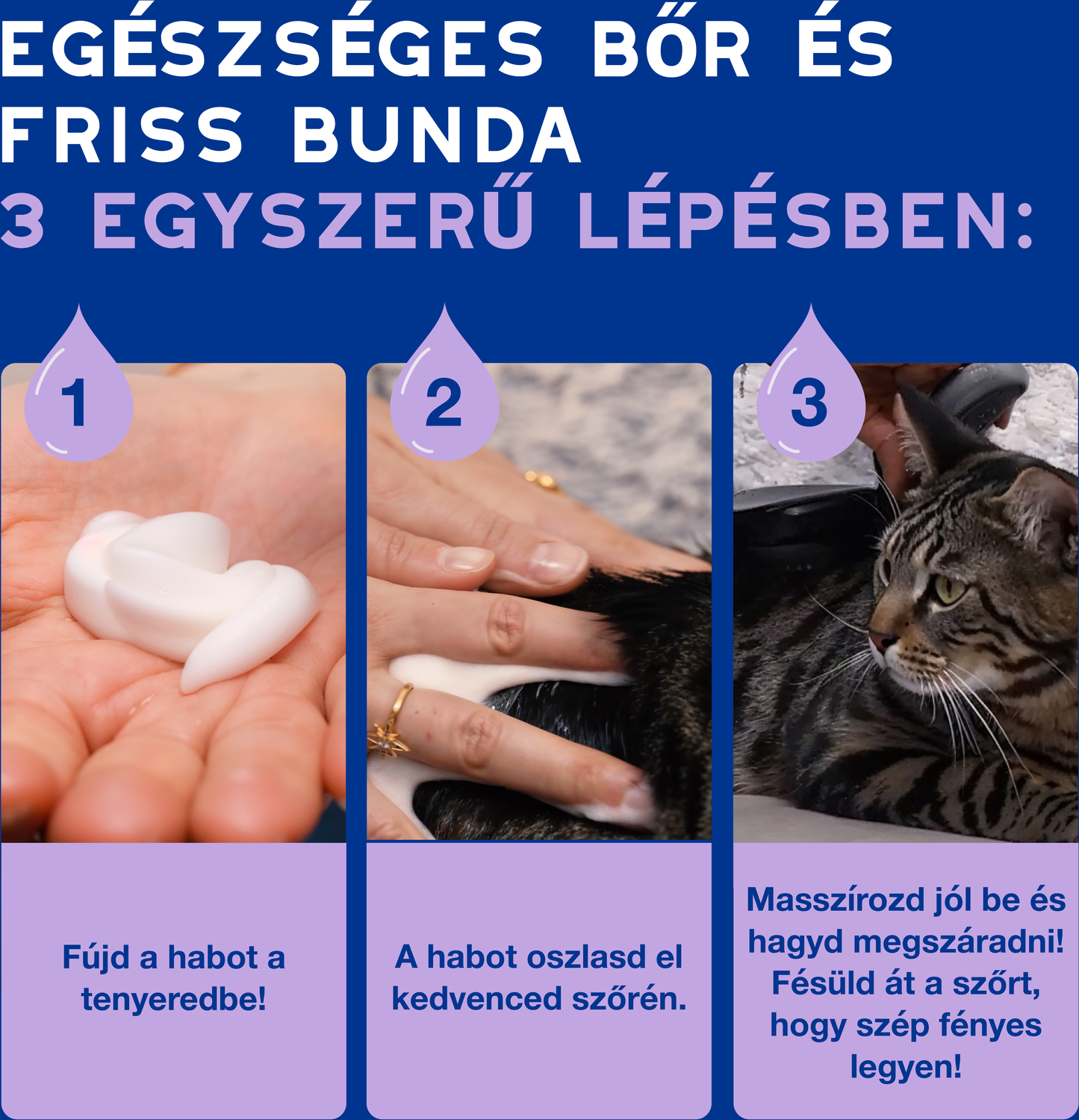 Száraz, kikefélt szőrön alkalmazandó. 1–2 pumpálásnyi habot a tenyérbe adagolva masszírozza a szőrbe egészen a bőrig, majd haladjon végig a macska testén. Ügyeljen arra, hogy a hab ne kerüljön a szemekbe. Nem szükséges leöblíteni, hagyja megszáradni, majd kefélje át a bundát.