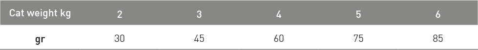 Etetési javaslat: Mindig biztosíts friss, tiszta ivóvizet. A napi adag az életkor, testsúly, kondíció és aktivitás függvényében módosítandó.