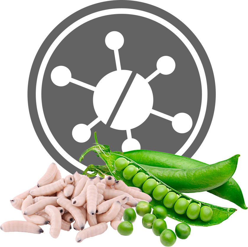 Összetétel: Borsó 63%, dehidratált rovarfehérje 22%, napraforgóolaj, lenmagolaj, mononátrium-foszfát, kalcium-karbonát, aloe vera (0,03%), rozmaring.
