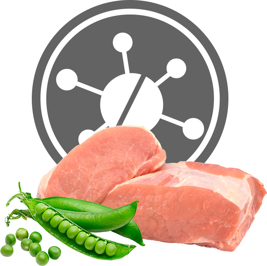 Összetétel: Borsó 55%, dehidratált sertés 25%, napraforgóolaj, hidrolizált sertésfehérje, lenmag (1%), nátrium-klorid, frukto-oligoszacharidok, glukózamin, aloe vera (0,04%), kondroitin-szulfát, rozmaring