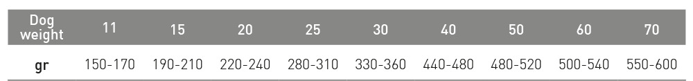 Etetési útmutató: Az ajánlott napi adagot a kutya mérete, testsúlya és aktivitása alapján kell meghatározni. A táp 3–8 héten keresztül alkalmazható mint diétás etetés intolerancia jeleit mutató kutyáknál. Ha a tünetek megszűnnek, akkor hosszú távon is etethető.