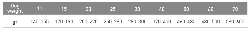 Etetési útmutató: Használata előtt állatorvos véleményének kikérése javasolt. Etesse a táblázatban megadott mennyiségek szerint, a kutya súlyának megfelelően, egyedüli táplálékforrásként. Ajánlott használati idő: 1-2 hét az akut hasmenéses időszakok alatt és a lábadozás során; 3-12 hét a rossz emésztés kompenzálására, de krónikus hasnyálmirigy-elégtelenség esetén egész életen át. Mindig biztosítson friss vizet a kutya számára.