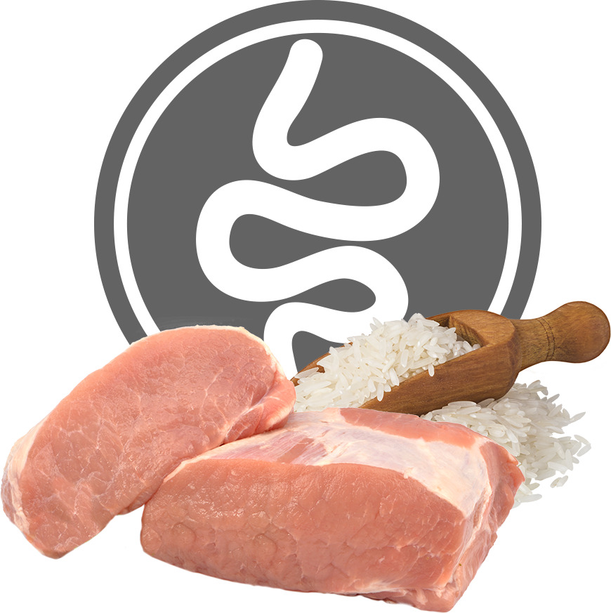 Összetétel: rizs (51%), dehidratált sertés (25%), sertészsír, szárított cikóriapép, dehidratált lucerna, monokalcium-foszfát, sörélesztő (3%), kálium-klorid, borsórost, lenmag, nátrium-klorid, mannán-oligoszacharidok (0,3%), frukto-oligoszacharidok (0,2%), útifű maghéj és magvak, β-1,3/1,6 glükánok sörélesztőből (Saccharomyces cerevisiae) (0,07%).