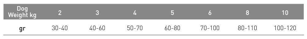 Etetési útmutató: A napi adagot a kutya méretéhez, testsúlyához és aktivitásához igazítva kell beállítani. Szárazon adandó, friss ivóvíz mindig legyen elérhető.