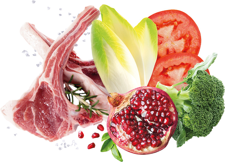 Összetétel: Dehidratált bárány 26%, rizs, borsó, sertészsír, hidrolizált állati fehérjék, szárított lucerna, kendermag (1%), élesztő, szárított cikóriapép (0,5%), nátrium-klorid, camelina olaj (0,3%), olívaolaj (0,3%), ß-1,3 glükán algákból (0,06%), glükózamin (0,04%), szárított brokkoli (0,03%), dehidratált gránátalma (0,03%), dehidratált paradicsom (0,03%), yucca, kondroitin-szulfát (0,01%).