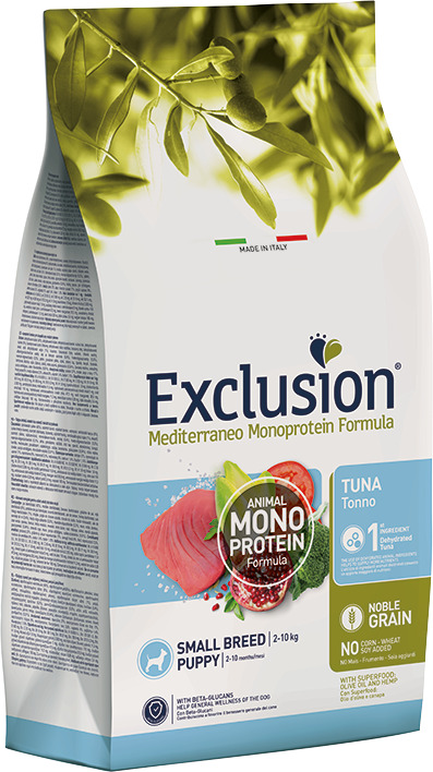 Az Exclusion Dog Mediterraneo Monoprotein Tuna Puppy Small Breed egy prémium kölyöktáp kistestű kutyáknak. Az állati fehérjét kizárólag dehidratált tonhal biztosítja, a szénhidrátforrás rizs. A formula mediterrán szuperélelmiszerekkel, természetes antioxidánsokkal gazdagított — csirkezsír, kukorica, búza és szója nélkül.