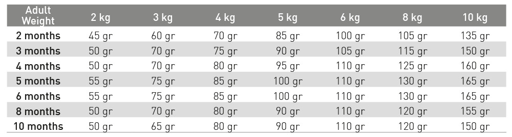 Etetési útmutató: A napi adagot a kölyök mérete, testsúlya és aktivitása alapján kell beállítani. Szárazon etetendő, friss ivóvíz mindig legyen elérhető.