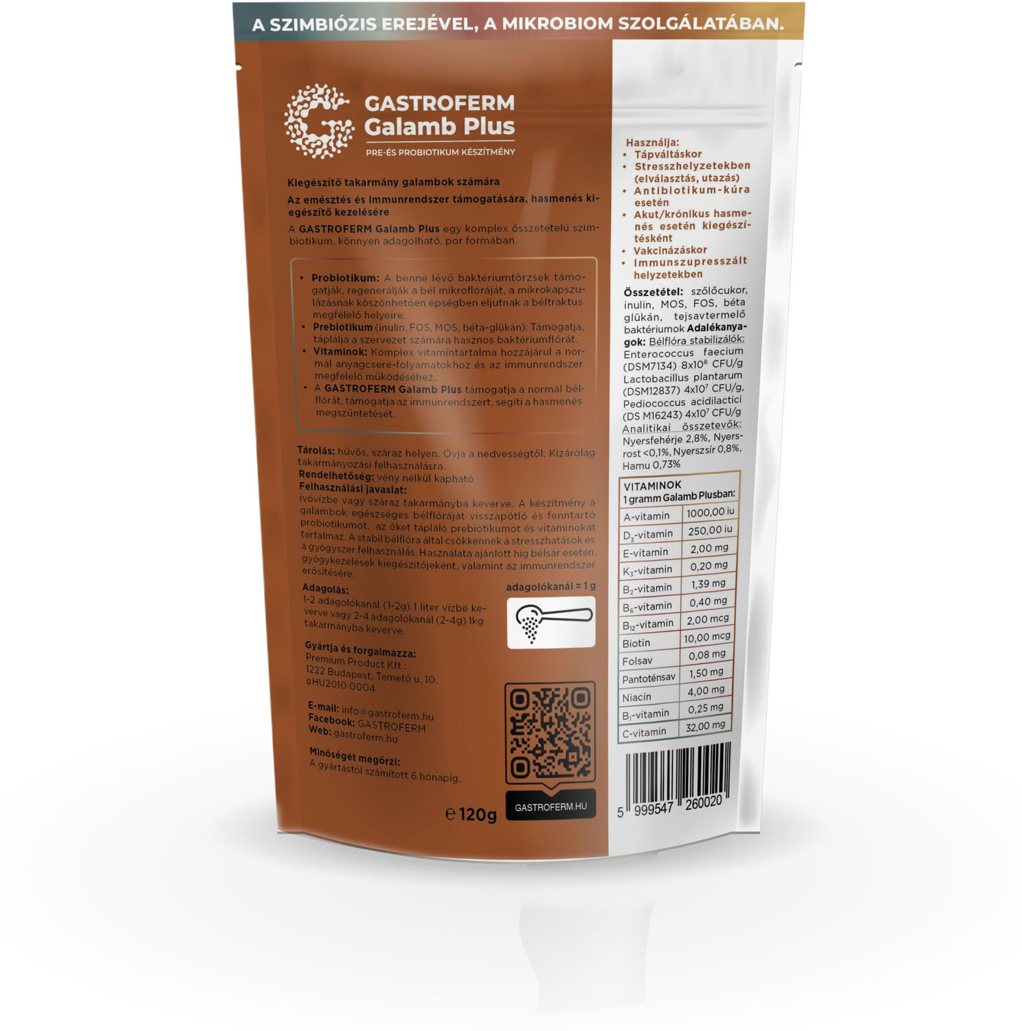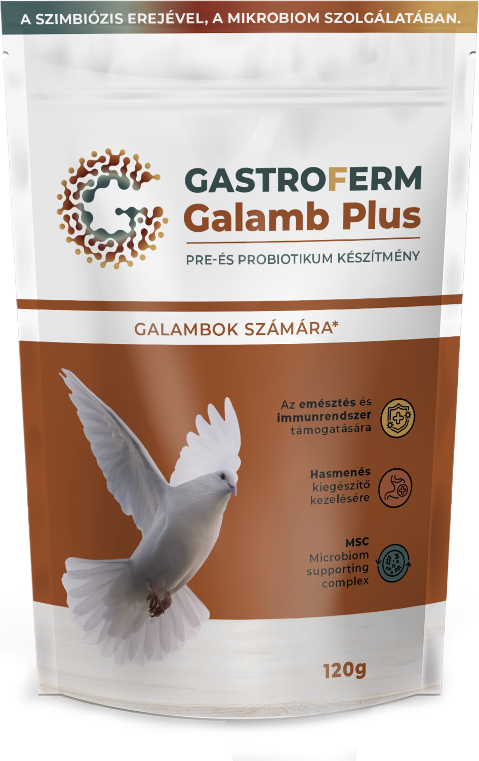 A Gastroferm Galamb Plus probiotikumot, prebiotikumot és vitaminokat tartalmazó komplex készítmény, amely támogatja a galambok egészséges bélflóráját, javítja az emésztést és a felszívódást, erősíti az immunrendszert és segít csökkenteni a gyógyszeres kezelések mellékhatásait. A galambtartás minden időszakában hatékony segítséget nyújt.