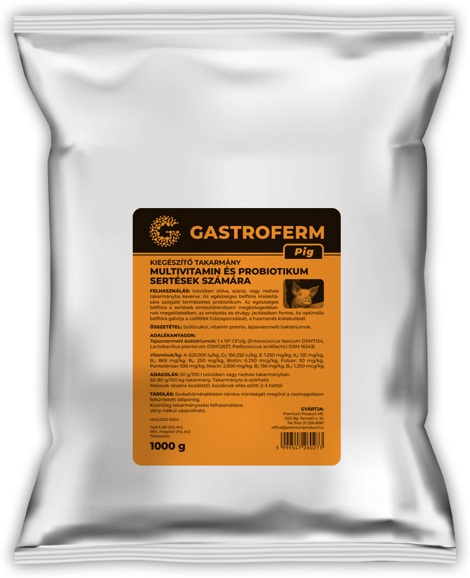 A Gastroferm Pig probiotikus kiegészítőtakarmány sertések számára vitamin premix-szel és tejsavtermelő baktériumokkal járul hozzá az emésztőrendszer megfelelő működéséhez, a bélflóra egyensúlyának fenntartásához és a jobb takarmányértékesüléshez.