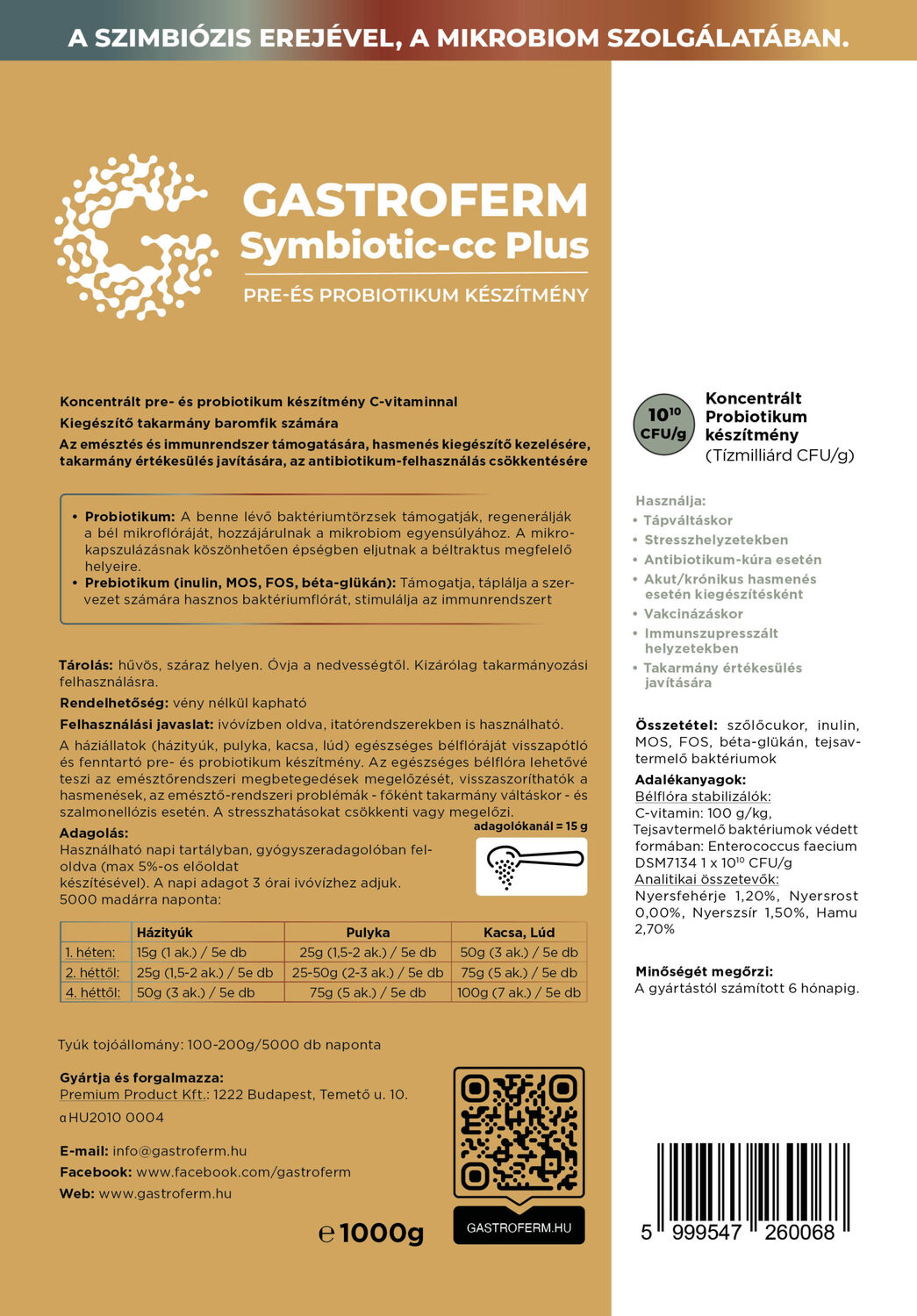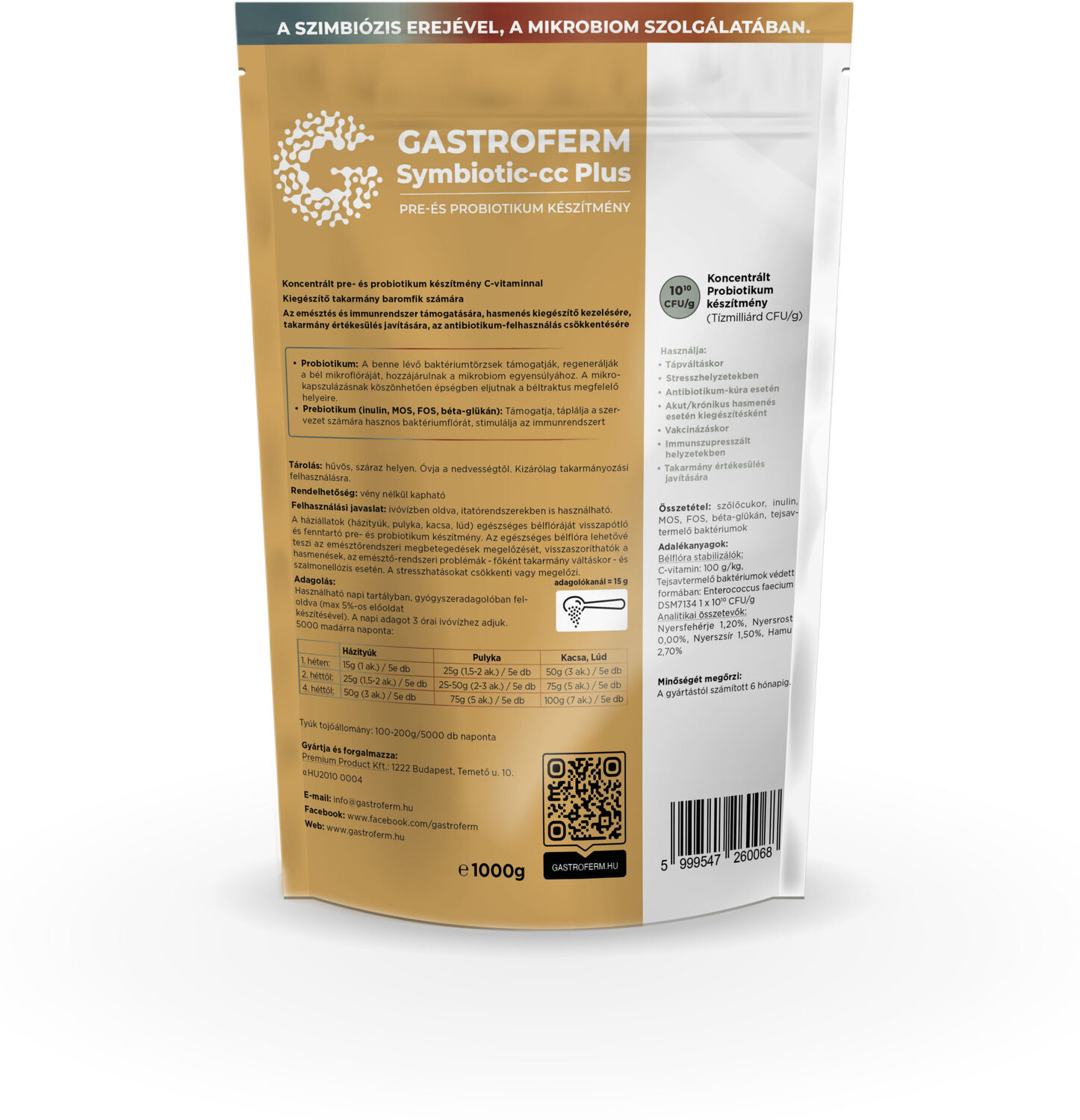 A Gastroferm Symbiotic-cc Plus kifejezetten baromfik számára kifejlesztett, por állagú kiegészítő takarmány, amely prebiotikumokat, probiotikumokat és C-vitamint tartalmaz. Összetétele hozzájárul a háziállatok – házityúk, pulyka, kacsa és lúd – egészséges bélflórájának visszapótlásához és hosszú távú fenntartásához.