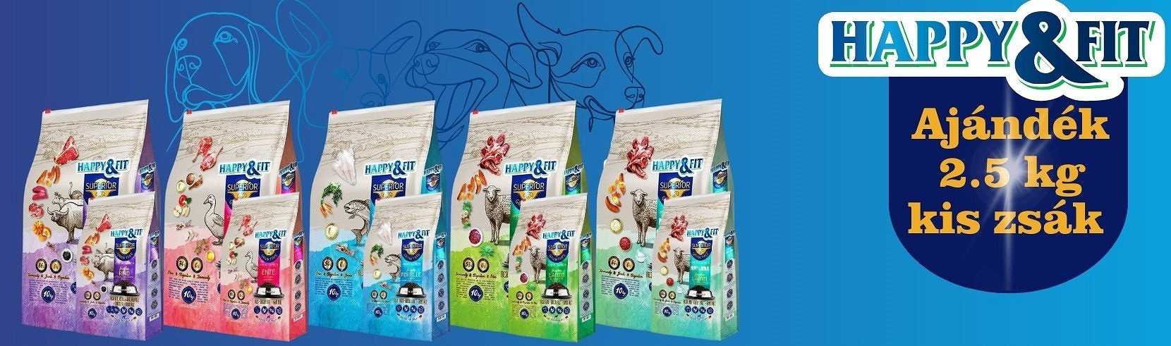 Most minden 10 kg-os Happy&Fit Superior táp mellé 2.5 kg-os zsákot adunk ajándékba.