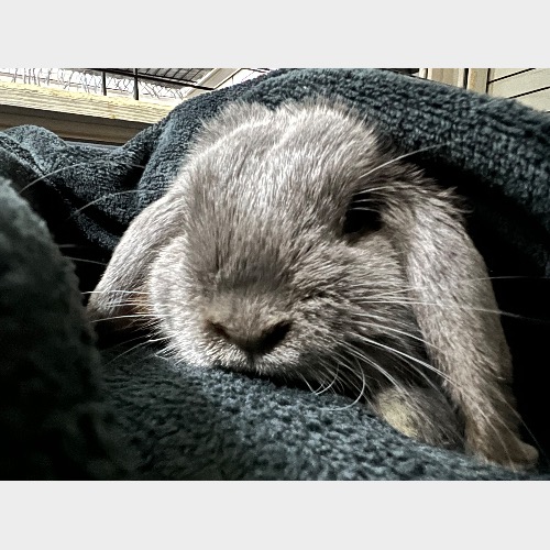 A nyuszi éjszakai kis lény, de érdekes módon, ha nem éhes, észre sem lehet venni, hogy ott van. Velünk van egy szobában. A ketrec tetején alszik éjszaka, nappal pedig bemegy a házába magától és délután 5 óráig nem hajlandó előbújni.