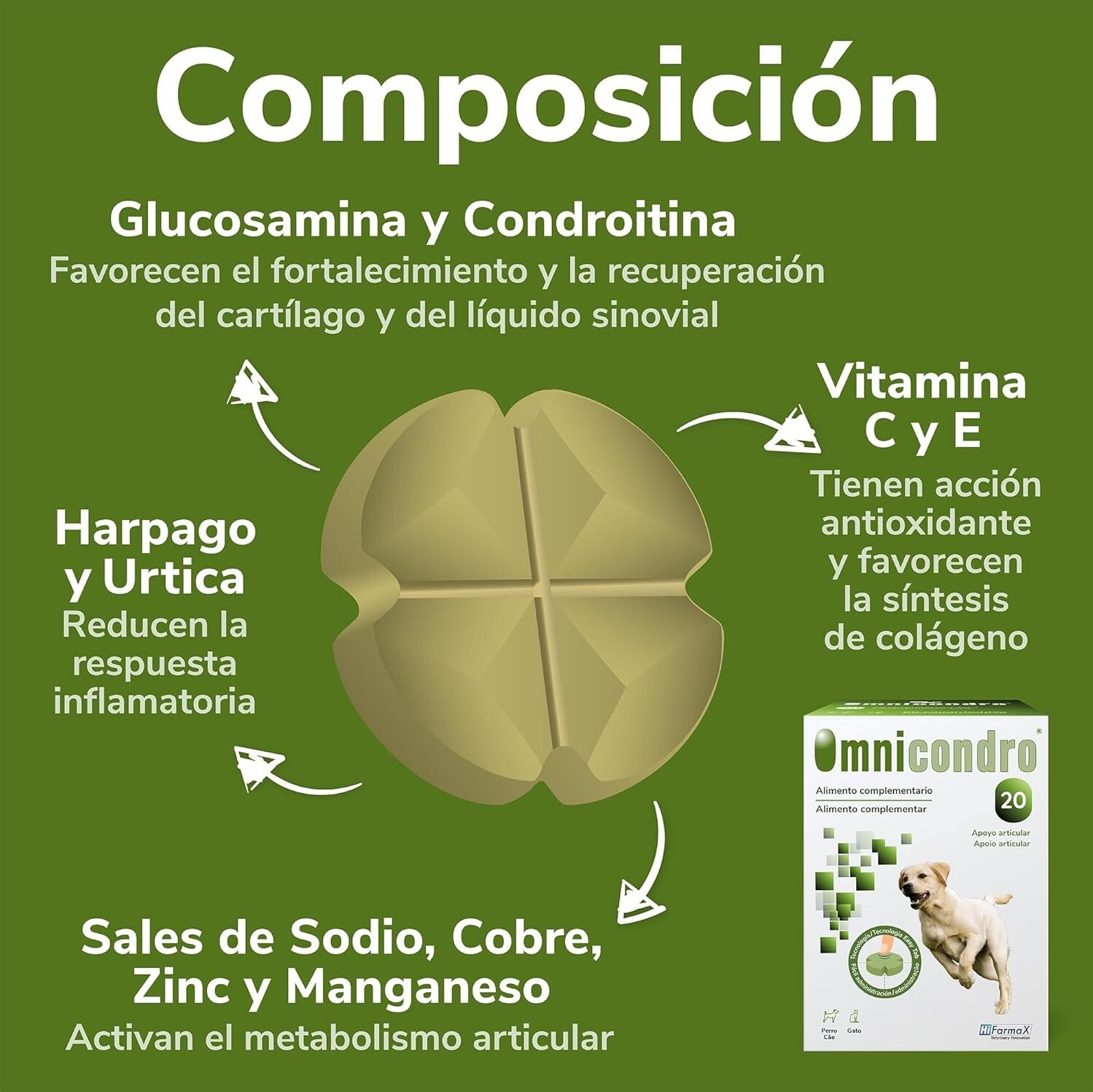 Az Omnicondro 20 ízületvédő tabletta teljeskörű megoldást kínál kutyák és macskák ízületi egészségének támogatására. A készítmény magas koncentrációban tartalmaz glükozaminoglikánokat, antioxidáns vitaminokat, gyulladáscsökkentő hatású gyógynövényeket, valamint a porc helyreállításához és védelméhez szükséges kétértékű kation természetű kofaktorokat.