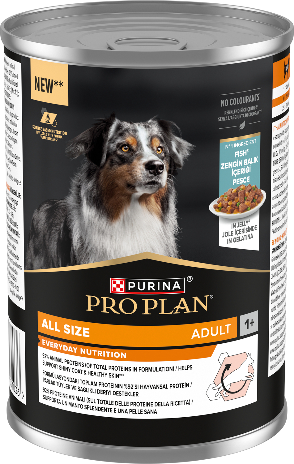 A Purina Pro Plan All Size Adult halban gazdag nedvestáp aszpikban egy kiváló minőségű, teljes értékű nedves eledel, melyet fajtától és testmérettől függetlenül minden felnőtt kutya táplálkozási igényeinek kielégítésére fejlesztettek ki. Az eledel gondosan válogatott összetevőket tartalmaz, melyek közül kiemelkedik a 14% hal. A receptúra magas fehérjetartalommal bír, melynek 91%-a állati eredetű, ezáltal támogatja az erős izomzat és az ideális testkondíció fenntartását.