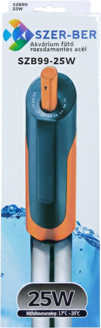 Szer-Ber SZB99 rozsdamentes acél akváriumfűtő hőfokszabályozóval. Ütésálló, törhetetlen fűtőrúd édesvízi akváriumba. Tekerős hőfokszabályozója segítségével igény szerint szabályozhatjuk által akváriumunk vizének hőmérsékletét 17-35 °C közötti tartományban. A beépített érzékelő által az eszköz csak akkor melegíti a vizet, amikor arra szükség van. Precízen tartja a beállított hőfokot 1 °C hibahatáron belül. A műanyag felső részén átvilágító indikátorfény által láthatjuk, mikor dolgozik épp a fűtő. Teljesen vízhatlan eszköz, függőleges, átlós vagy vízszintes helyzetben is elhelyezhető a víz alatt. Tapadókorongjával könnyen rögzíthető. Ütésállósága miatt ideális megoldás teknős vagy vehemensebb díszhalak akváriumába, valamint tisztítása vagy pakolása/karbantartása is nyugodtabban végezhető.